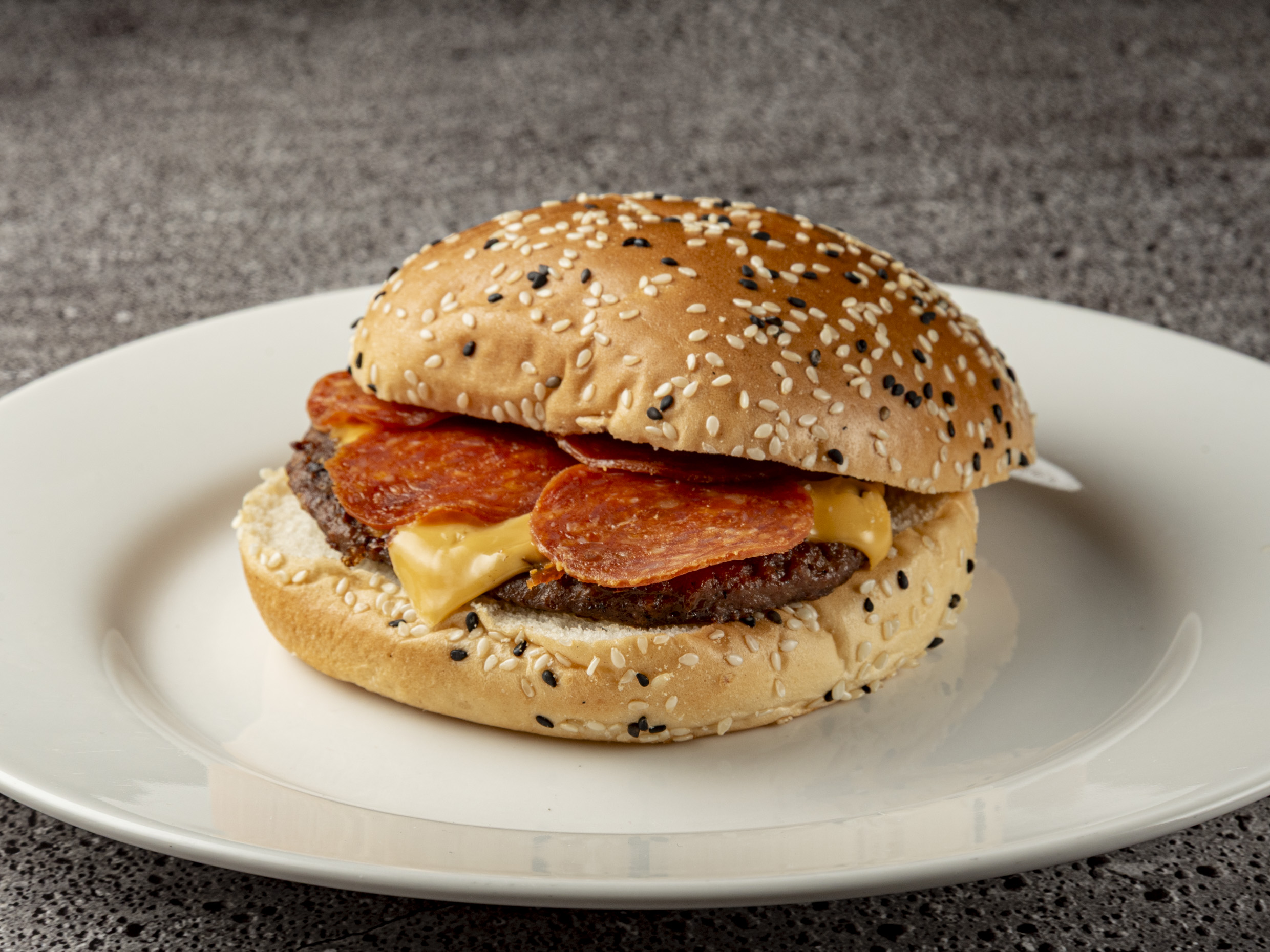 100 gr de carne de res, peperonis, queso mozarella, jitomate, cebolla, lechuga, crema, mayonesa, mostaza y catsup