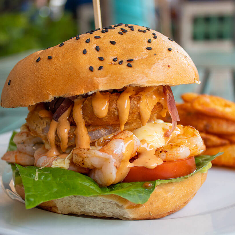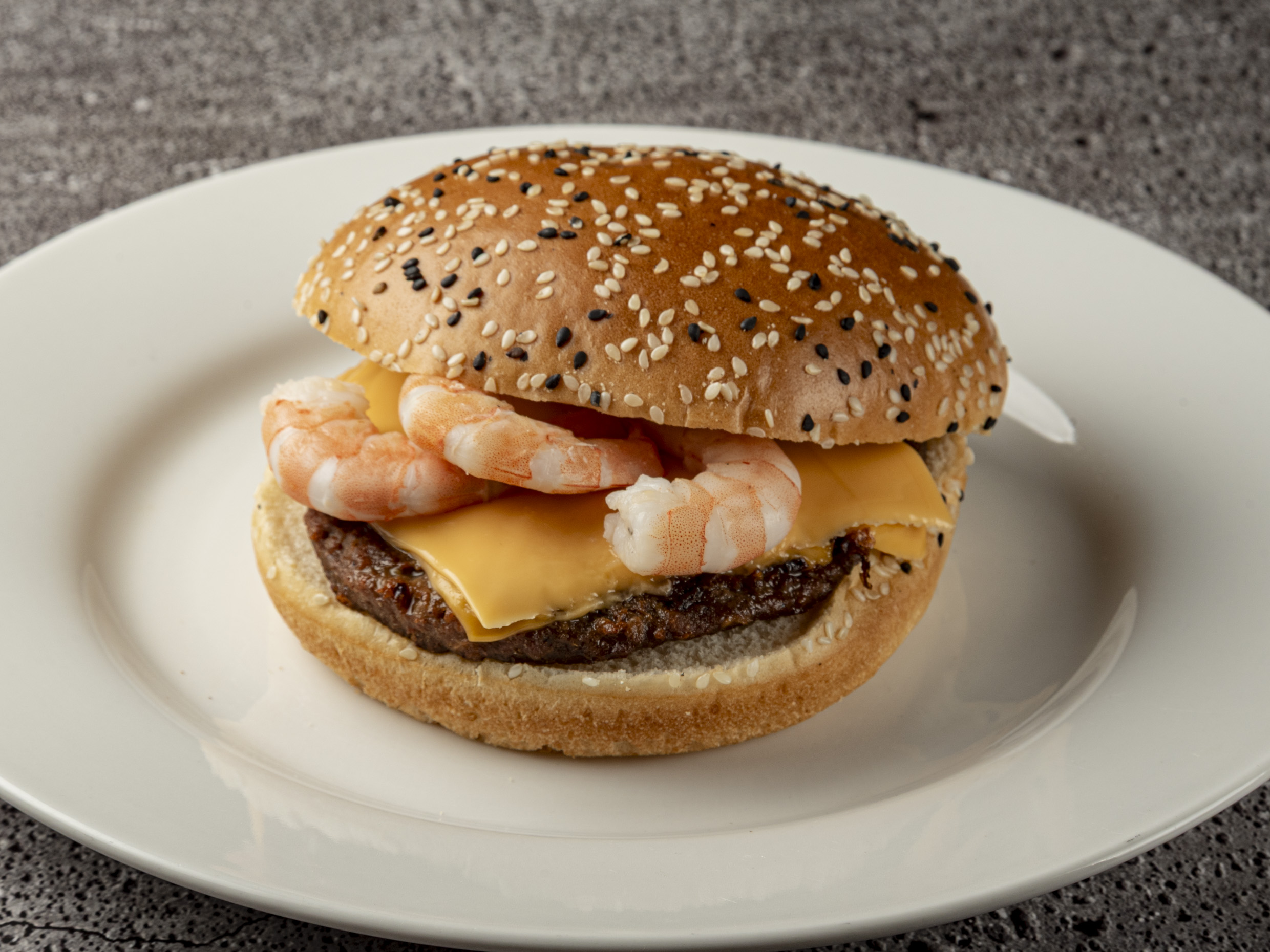 100 gr de carne de res, camarones gratinados , jitomate, cebolla, lechuga, crema, mayonesa, mostaza y catsup