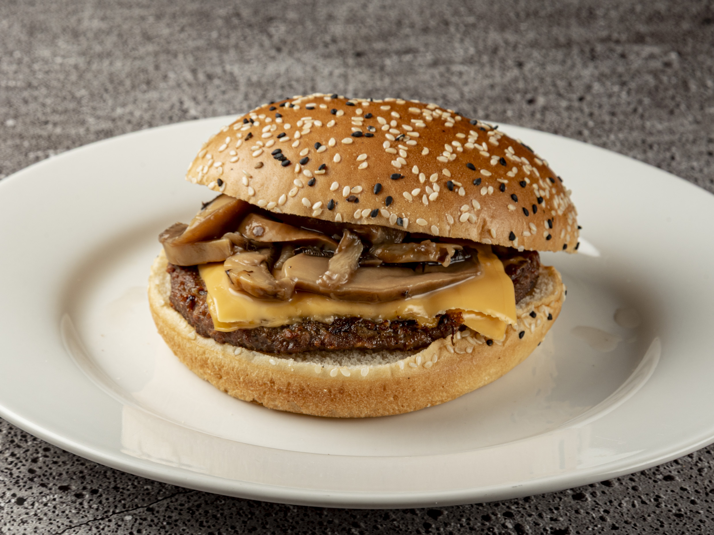 100 gr de carne de res, champiñones gratinados con queso mozarella, jitomate, cebolla, lechuga, crema, mayonesa, mostaza y catsup