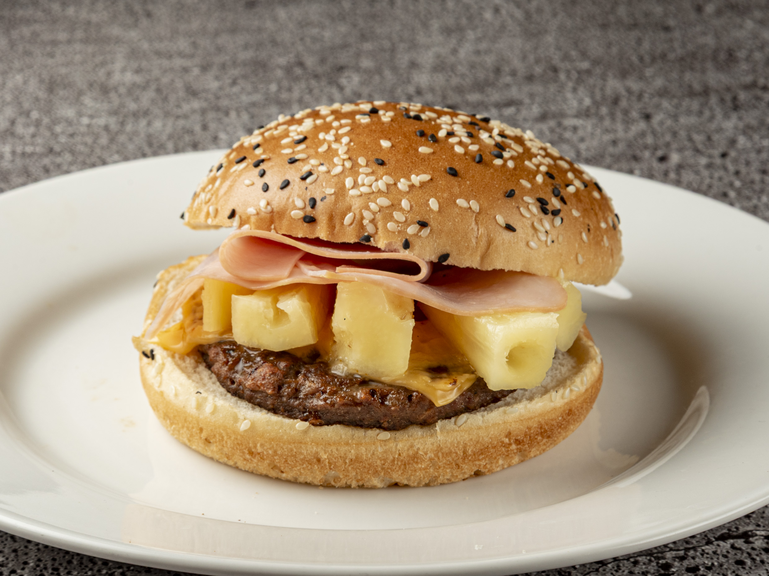 100 gr de carne de res, jitomate, piña, jamón, cebolla, lechuga, crema, mayonesa, mostaza y catsup