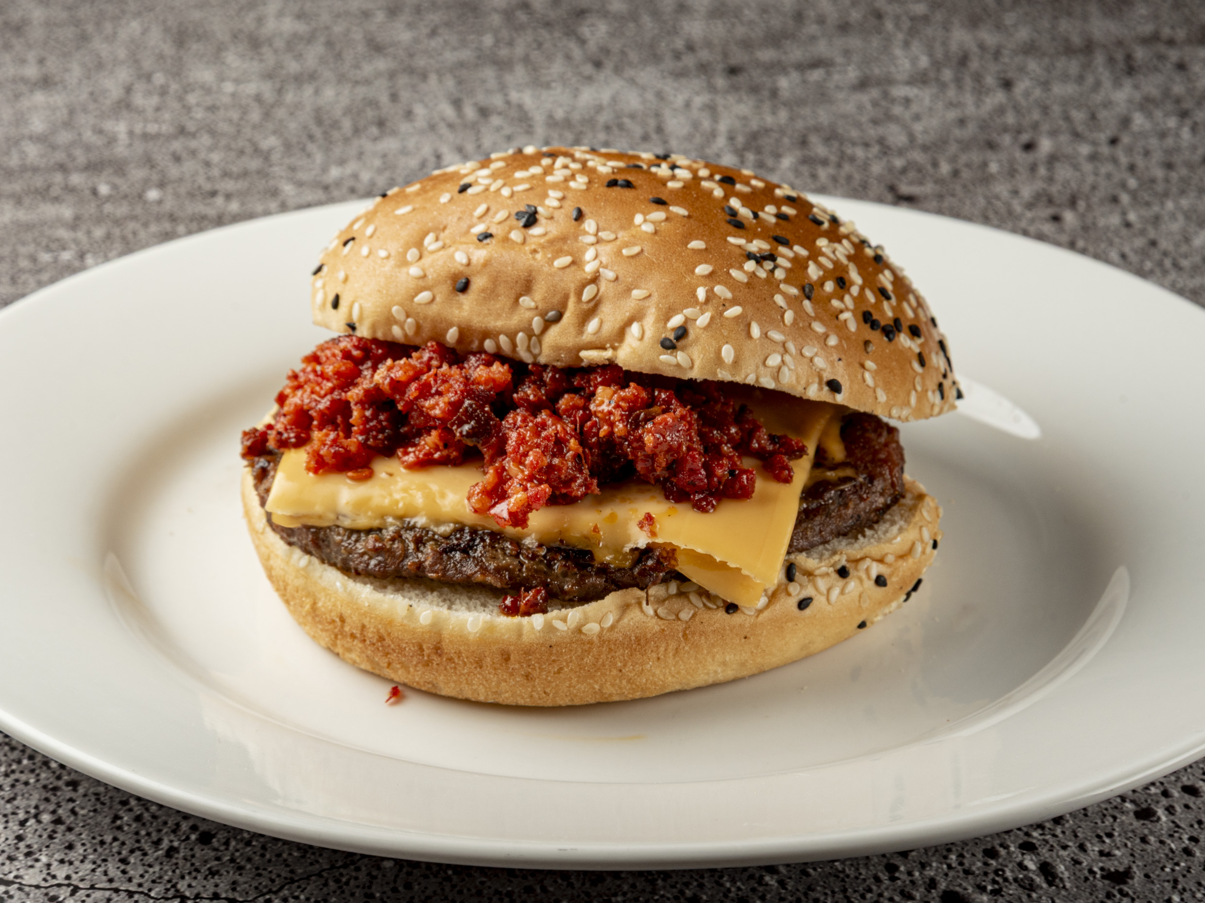 100 g De carne de res, jitomate, cebolla, lechuga, queso amarillo, mayonesa.