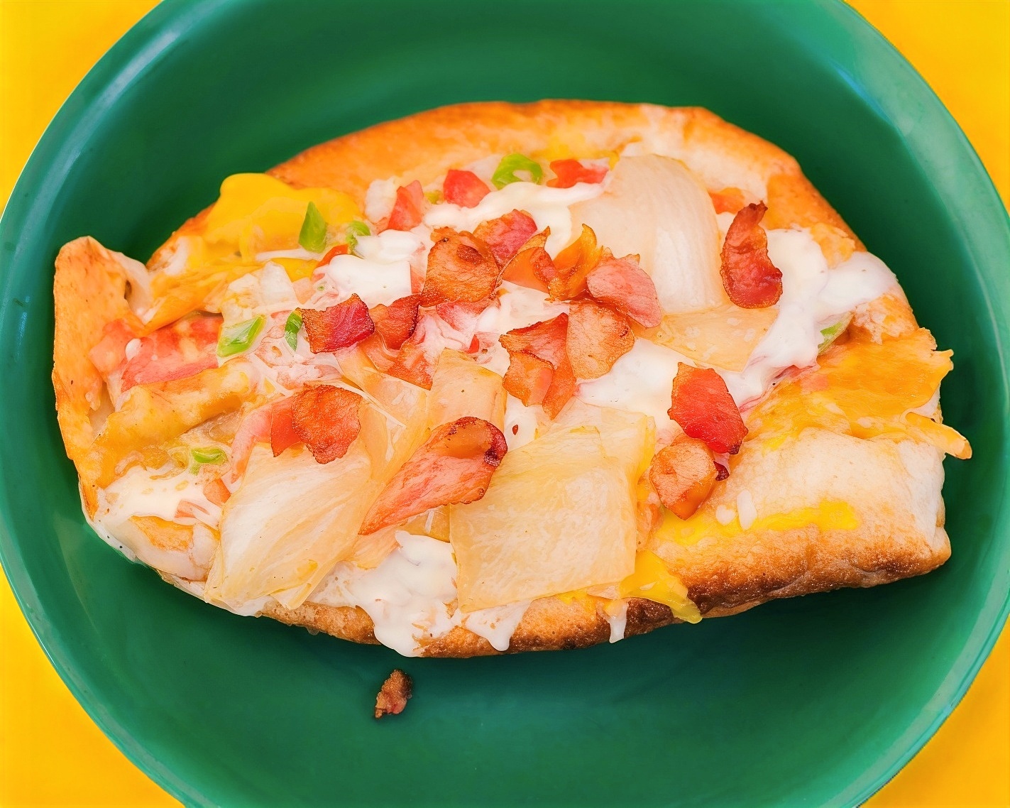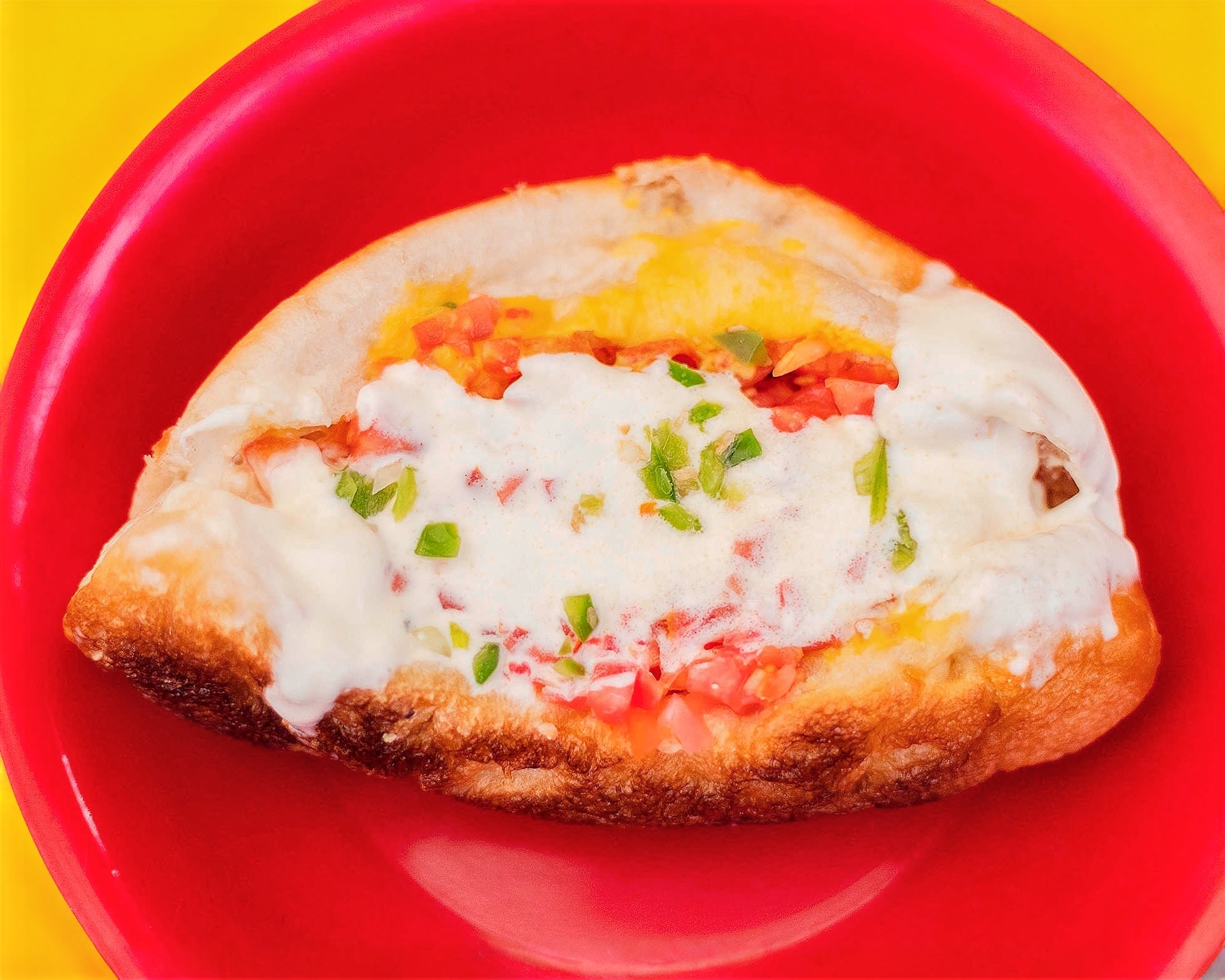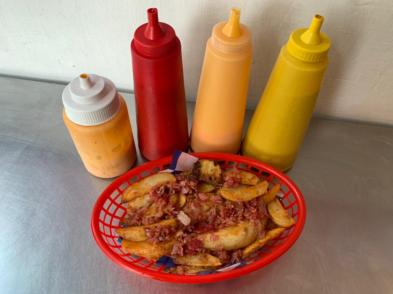 Dogos de salchicha con tocino envuelta en queso con mostaza, chile verde, cebolla, tomate, crema, tocino y cebolla guisada.