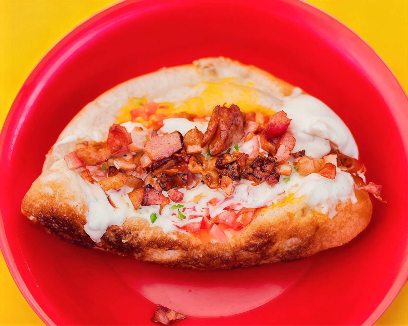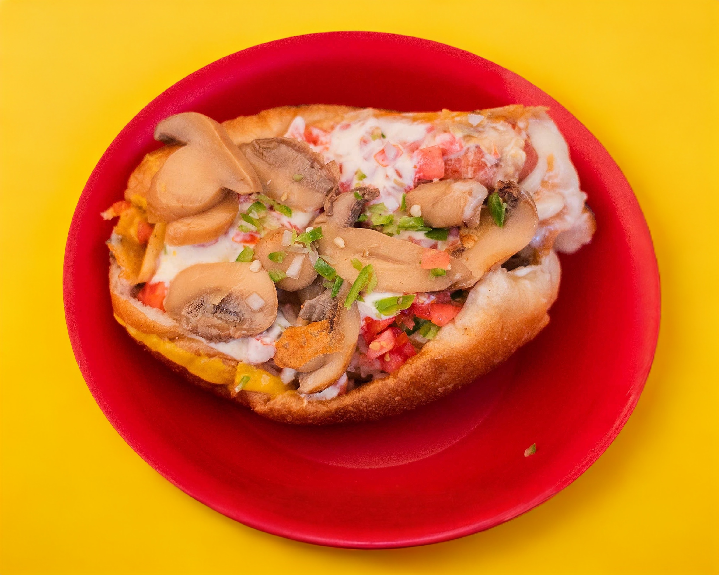 Dogo con salchicha de tocino, queso y champiñones con mostaza, chile verde, cebolla, tomate, crema, tocino y cebolla guisada.
