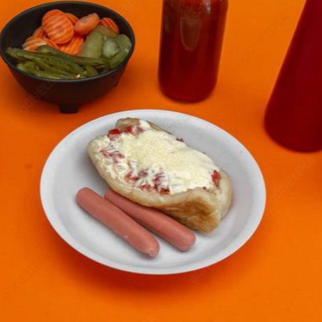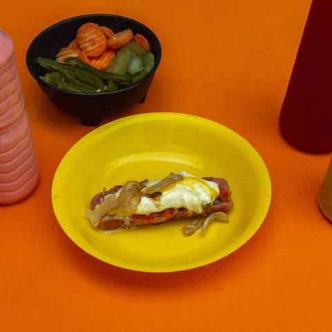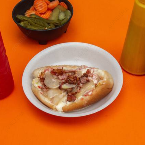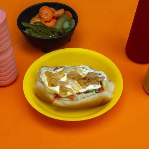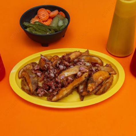 Mostaza, chile verde, cebolla, tomate, crema, sal, tocino, cebolla guisada, salchicha preparada con orden papa gajo.
