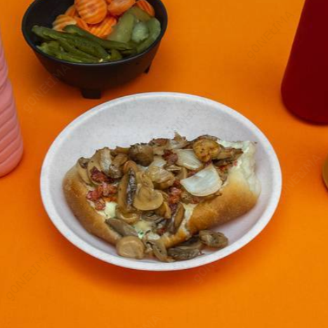 Champiñones, queso gratinado y salchicha de pavo, mostaza, chile verde, cebolla, tomate, crema, sal, tocino, cebolla guisada, pueden pedir el aderezo por separado para que no se aguade.
