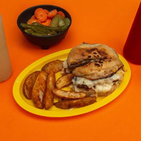 Queso gratinado, mostaza, chile verde, cebolla, tomate, crema, sal, tocino, cebolla guisada, pueden pedir el aderezo por separado para que no se aguade.