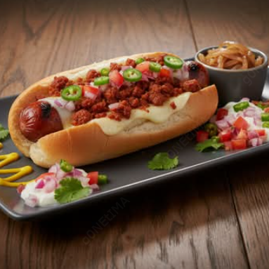 Chorizo, queso y salchicha, preparado con mostaza, chile verde, cebolla, tomate, crema, tocino picado y cebolla guisada, pueden pedir el aderezo por separado para que no se aguade.