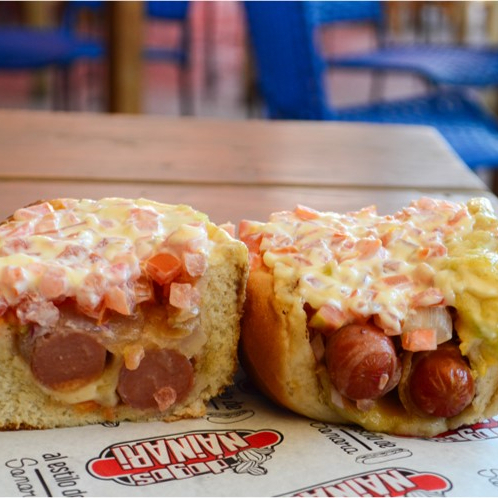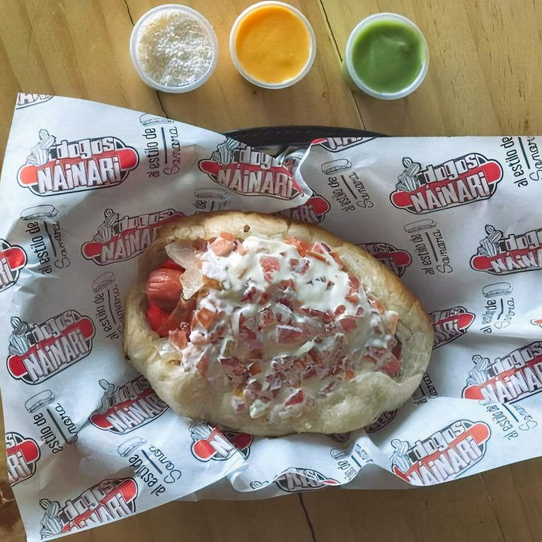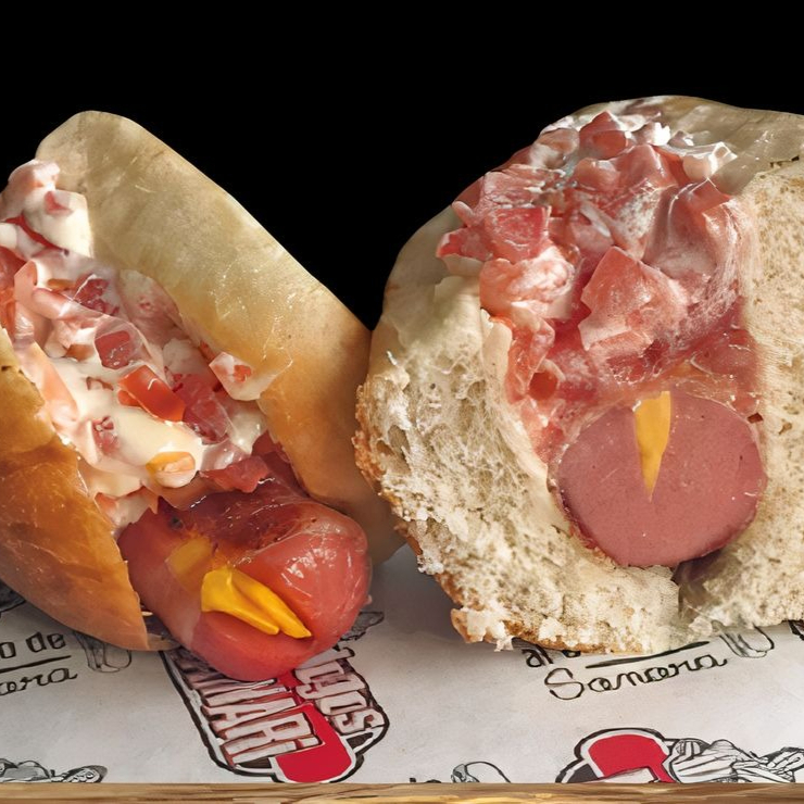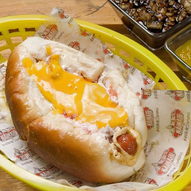 Doble salchicha rosarito envuelta cada una en tocino y queso manchego.