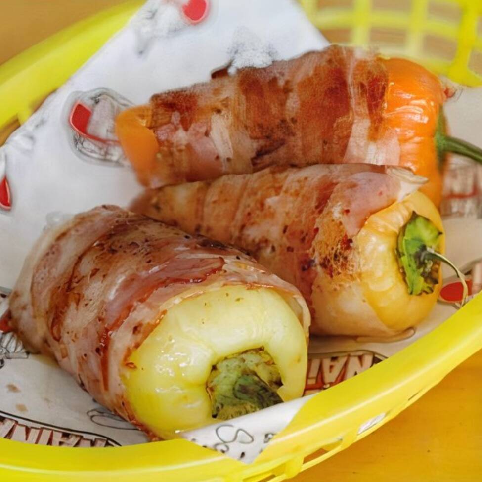 Chile anaheim relleno de queso manchego y salchicha de pavo, envuelto en 2 tocinos.