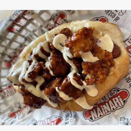 Trozos de boneless bañados en salsa a elección y una salchicha rosarito envuelta en tocino.