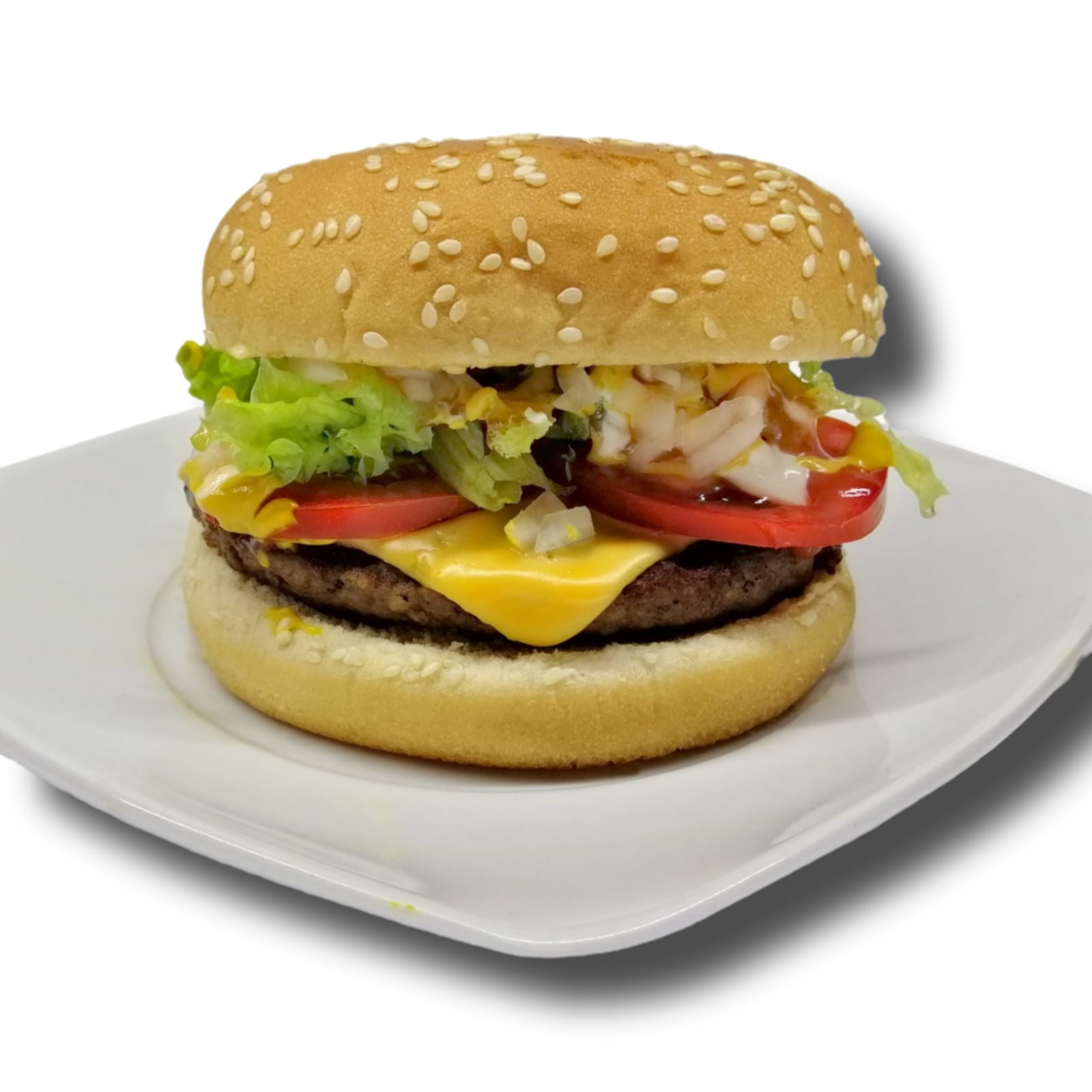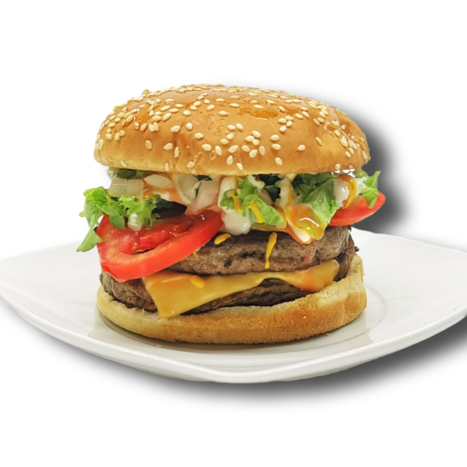Doble sirloin de res con queso amarillo, jitomate, lechuga, crema, cátsup, mostaza y cebolla.