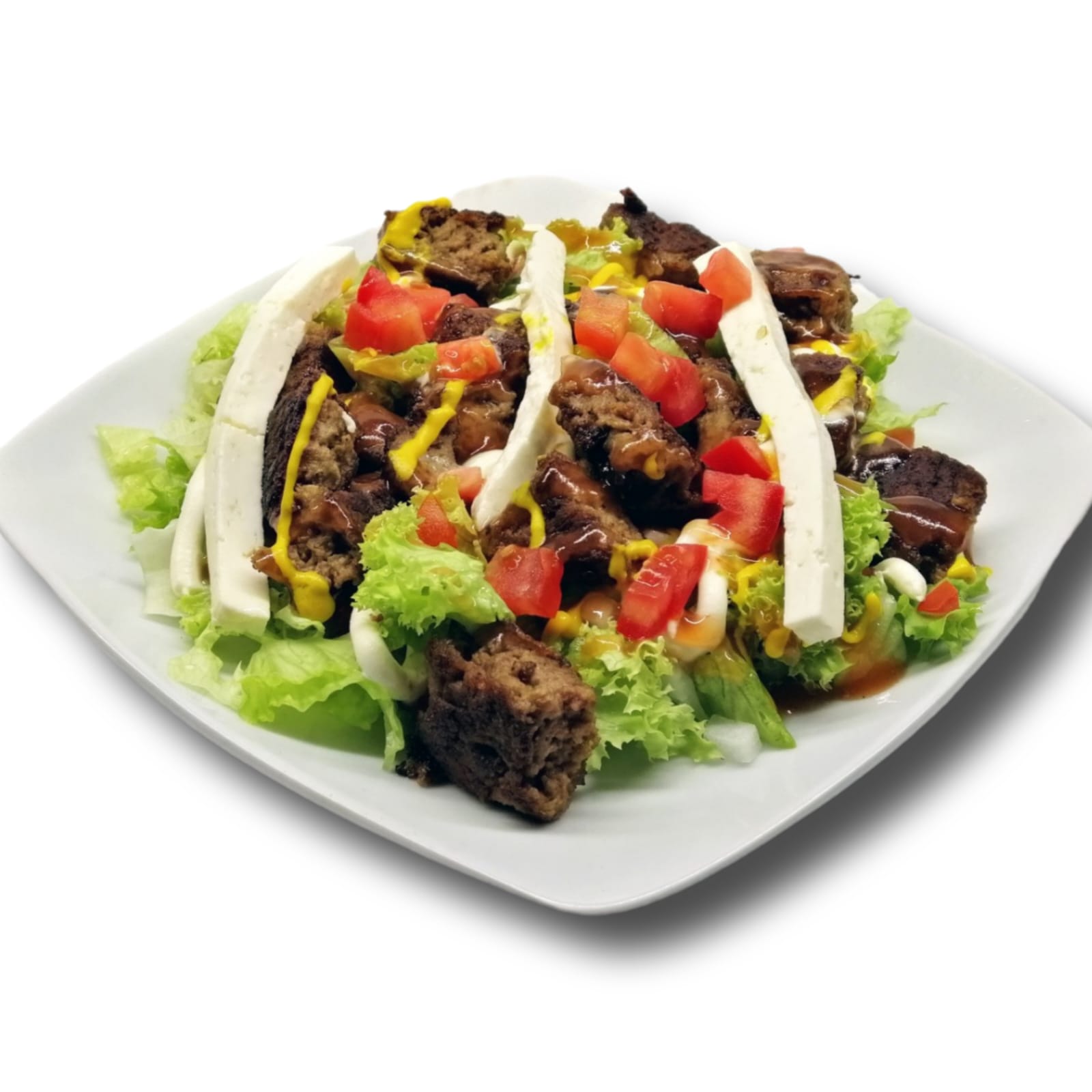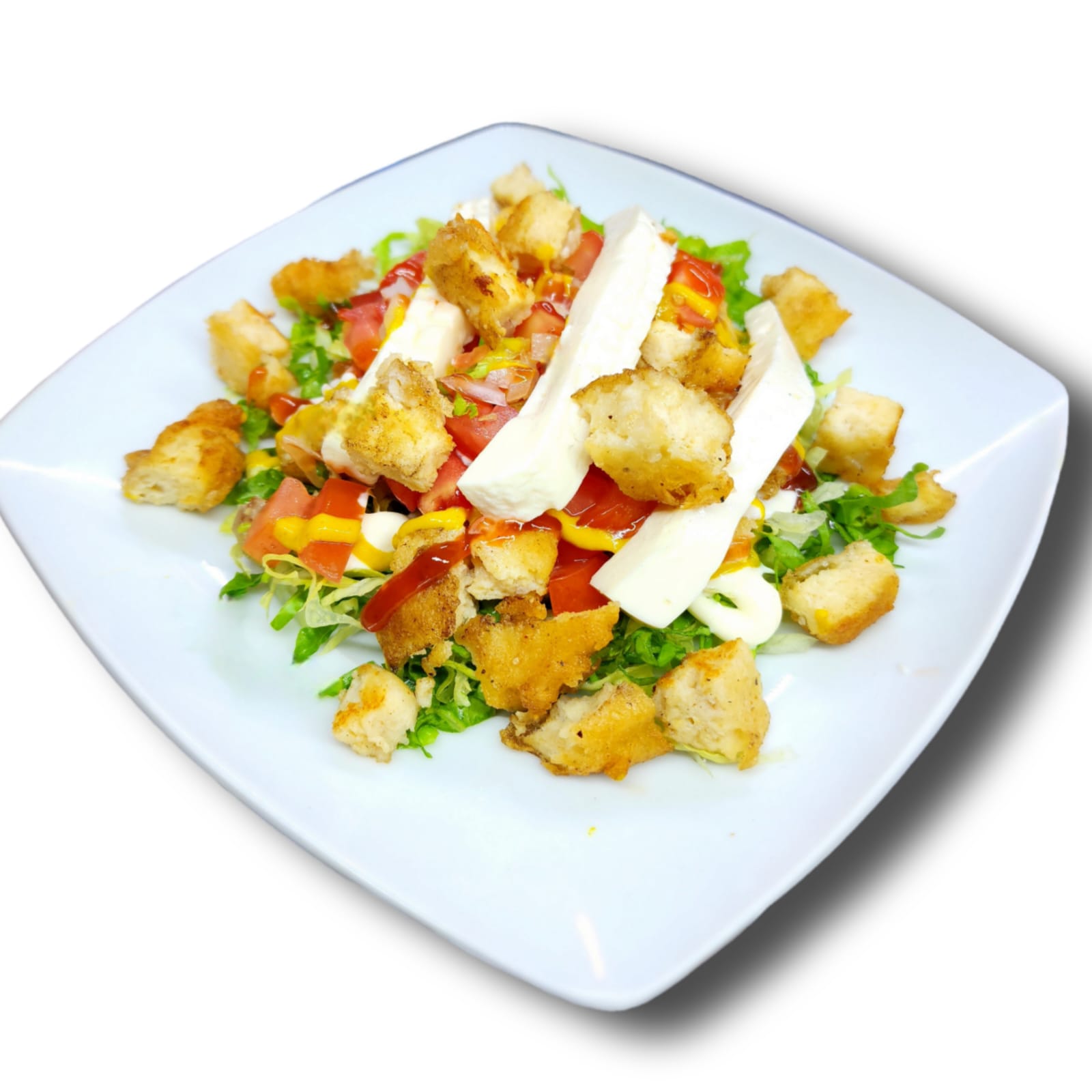 Carne de pollo empanizado tipo tempura picada sobre una cama de lechuga con crema, jitomate, cebolla, ketchup, mostaza y queso panela