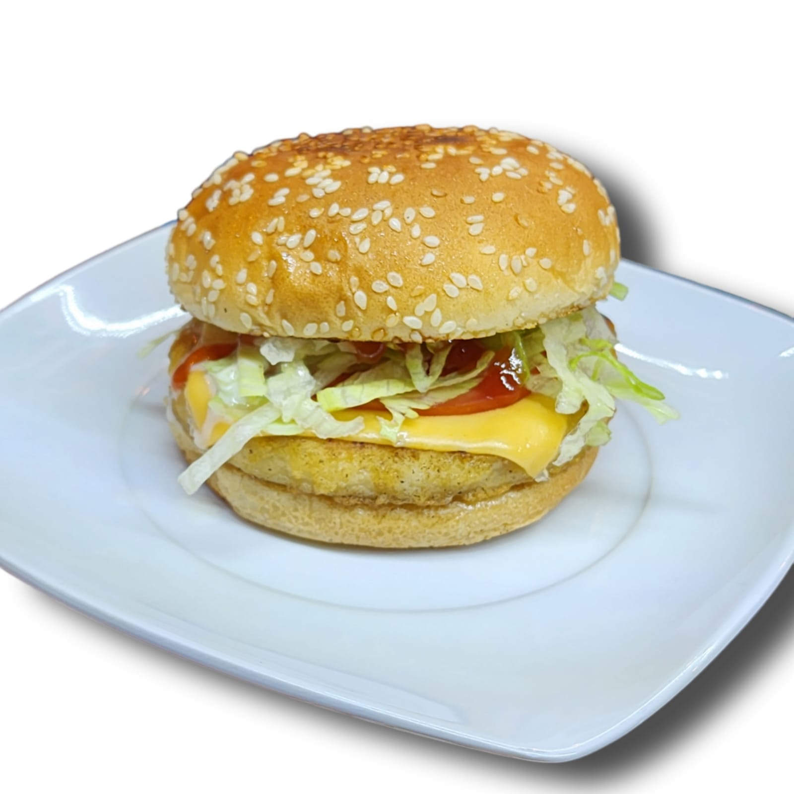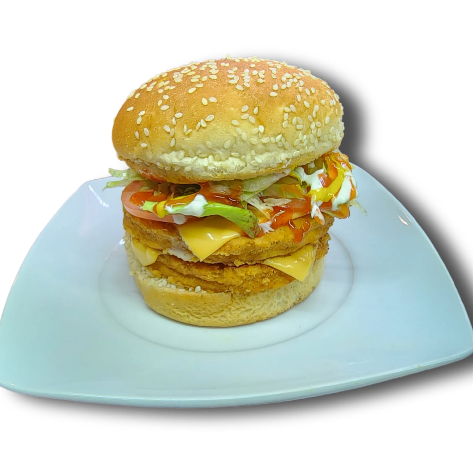 Doble carne de pollo empanizado con queso amarillo, jitomate, lechuga, crema, cátsup, mostaza y cebolla.