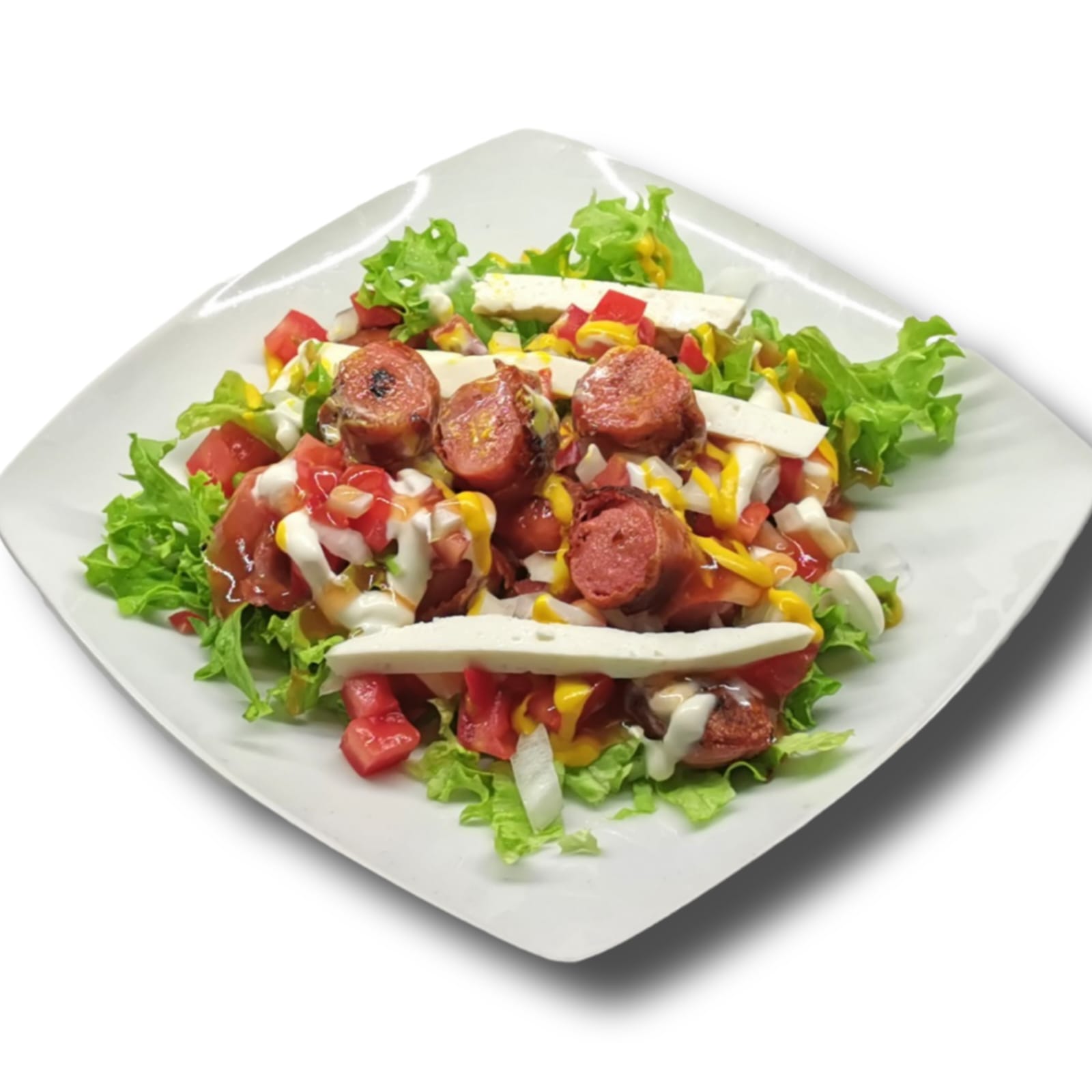 1 pza de salchicha tipo viena envuelta en tocino picada sobre una cama de lechuga con crema, jitomate, cebolla, ketchup, mostaza y queso panela