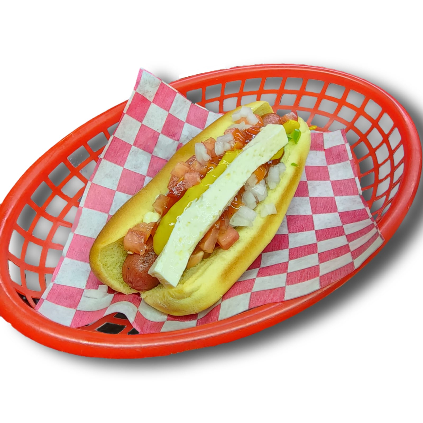 Salchicha tipo Viena envuelta en Tocino con chile serrano picado, crema, mayonesa, jitomate, cebolla, cátsup, mostaza y queso panela.
