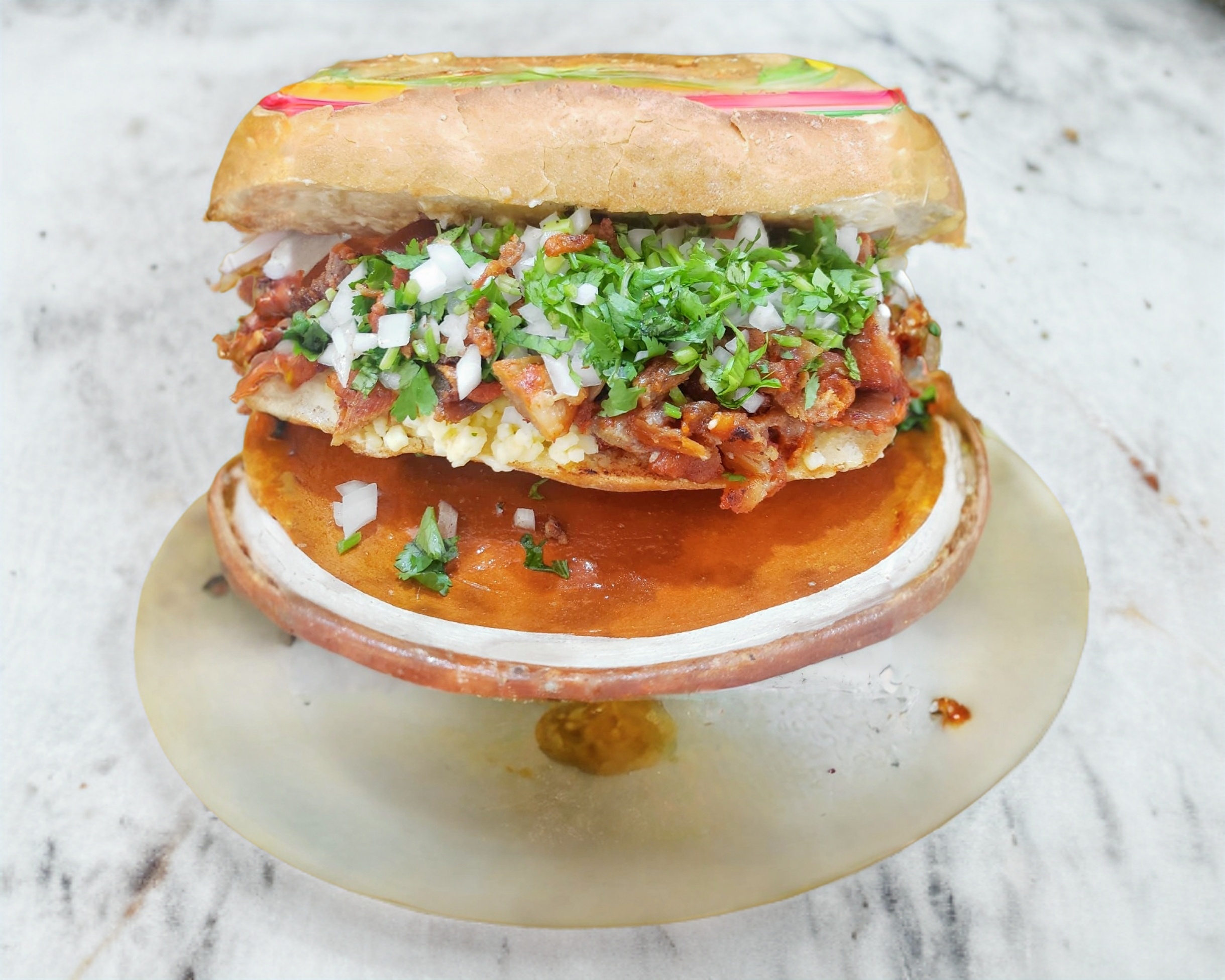 Bolillo con chicharron en salsa roja de la casa cilantro y cebolla
