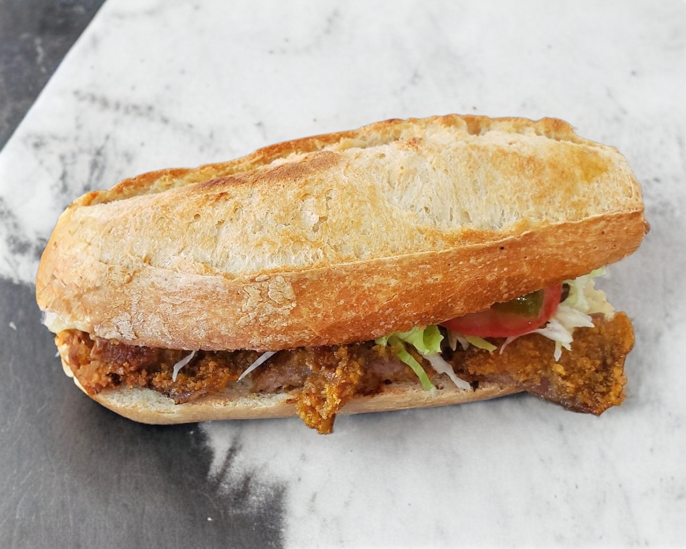 bolillo con milanesas de res,jitomate,cebolla,chiles jalapeños y nuestro aderezo de la casa