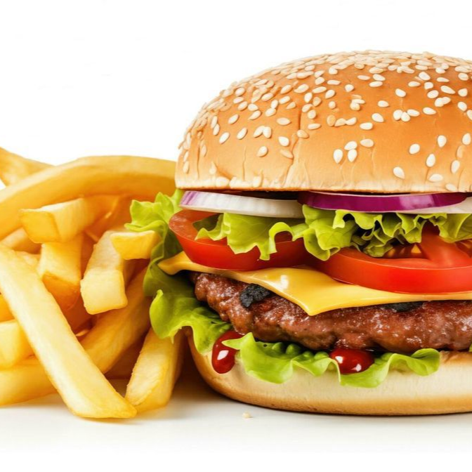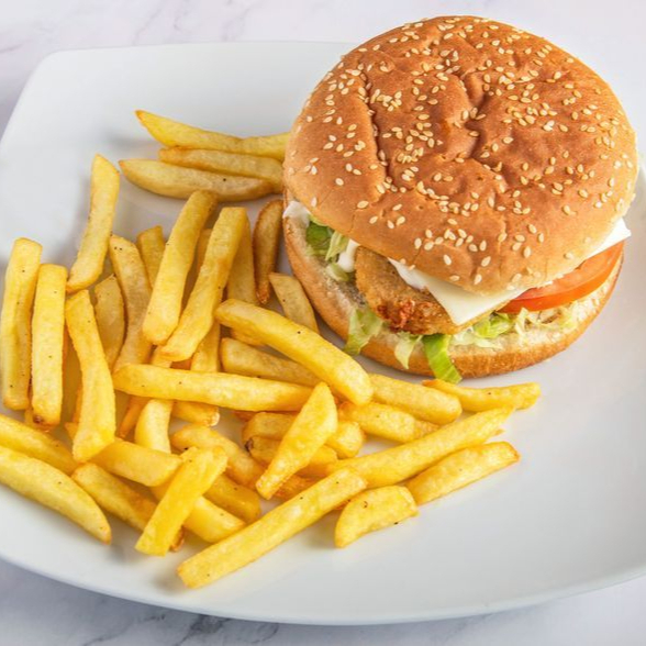 Hamburguesa de pollo (130gramos) y papas fritas
