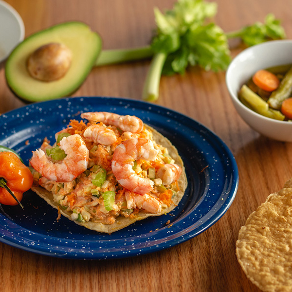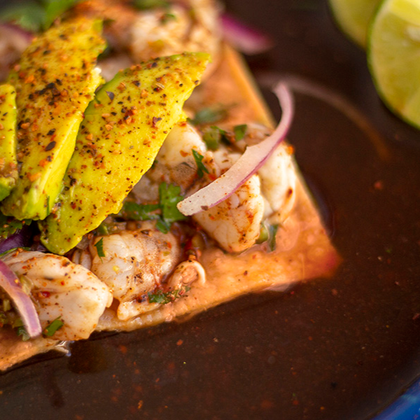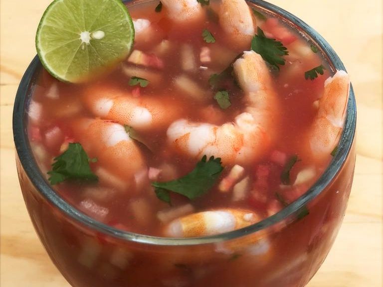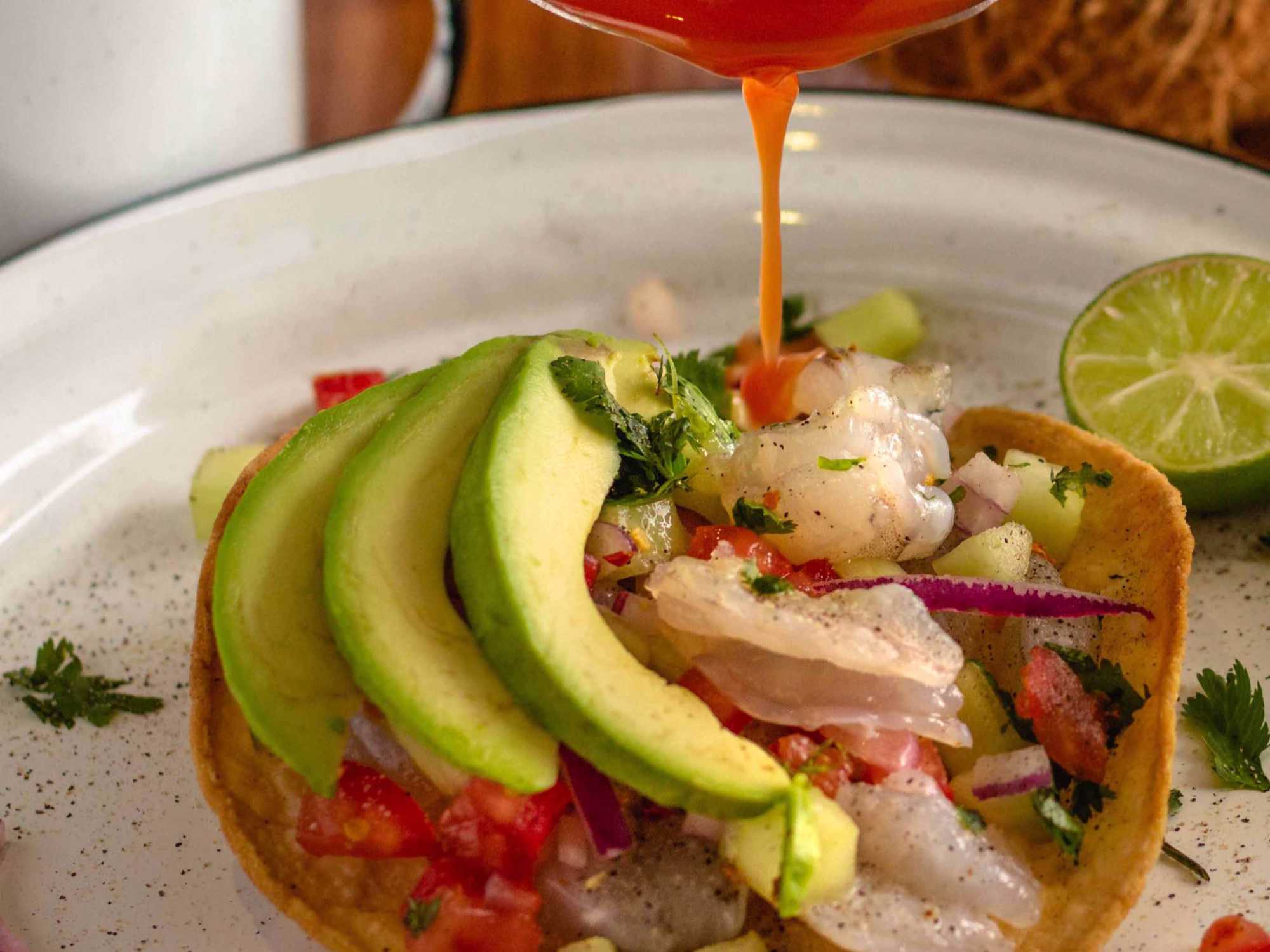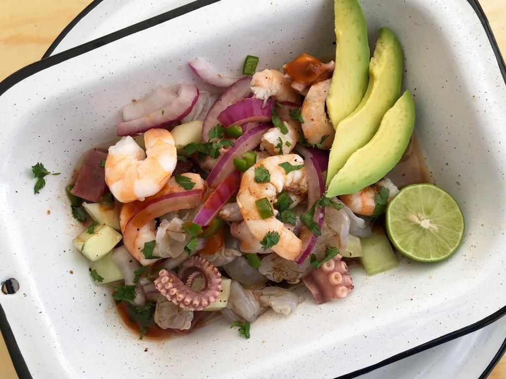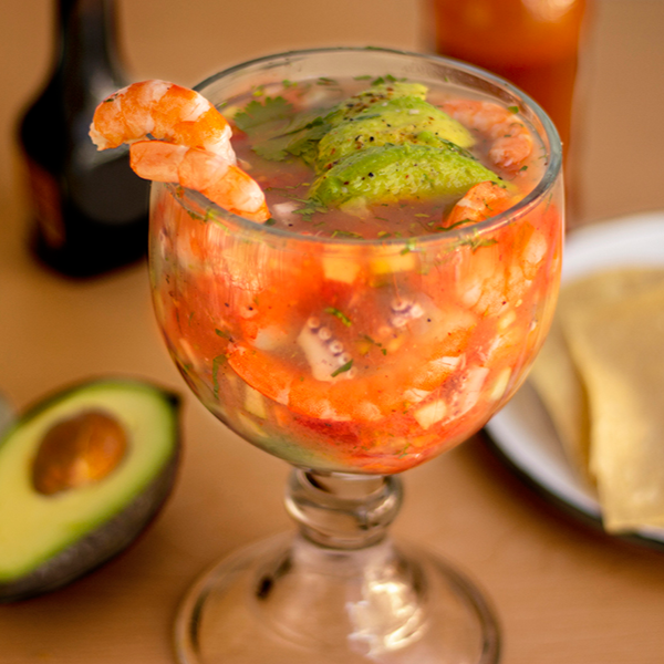 Camarón curtido con limón, cebolla, aguacate, chile y salsa secreta de Doña Mar