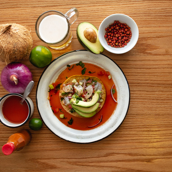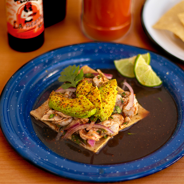 Con clamato, pepino, tomate, cebolla, chile, limón, y nuestra salsa especial, con tostadas artesanales.