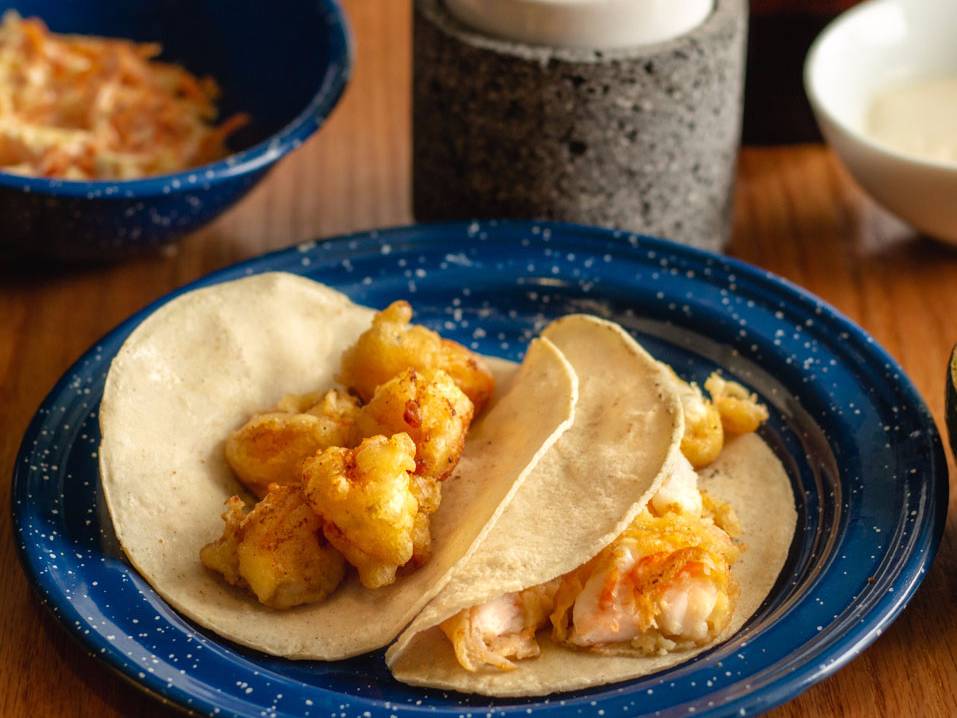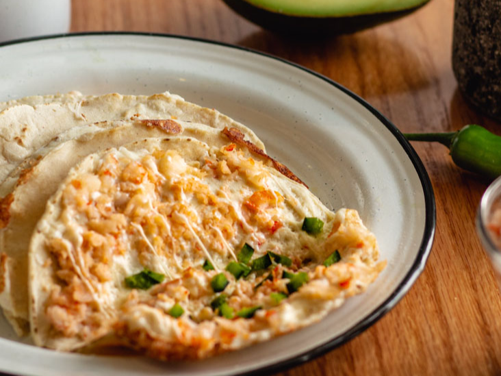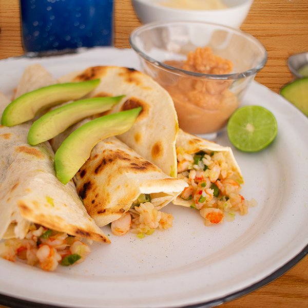Rica tortilla de harina con machaca de camarón, aguacate y aderezos