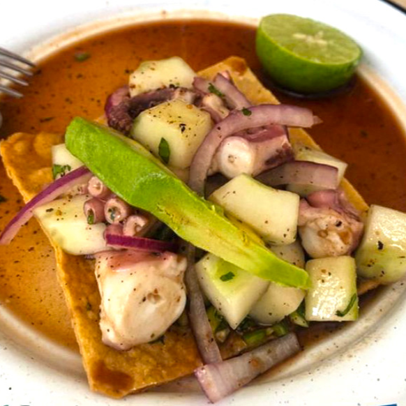 Pulpo estilo aguachile con las mejores salsas de Doña Mar