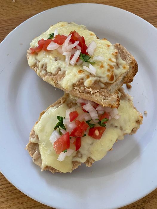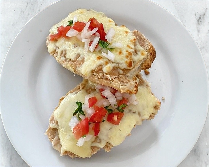 Una pieza de bolillo partida por la mitad, con frijoles y queso gratinado, acompañado de salsa mexicana.