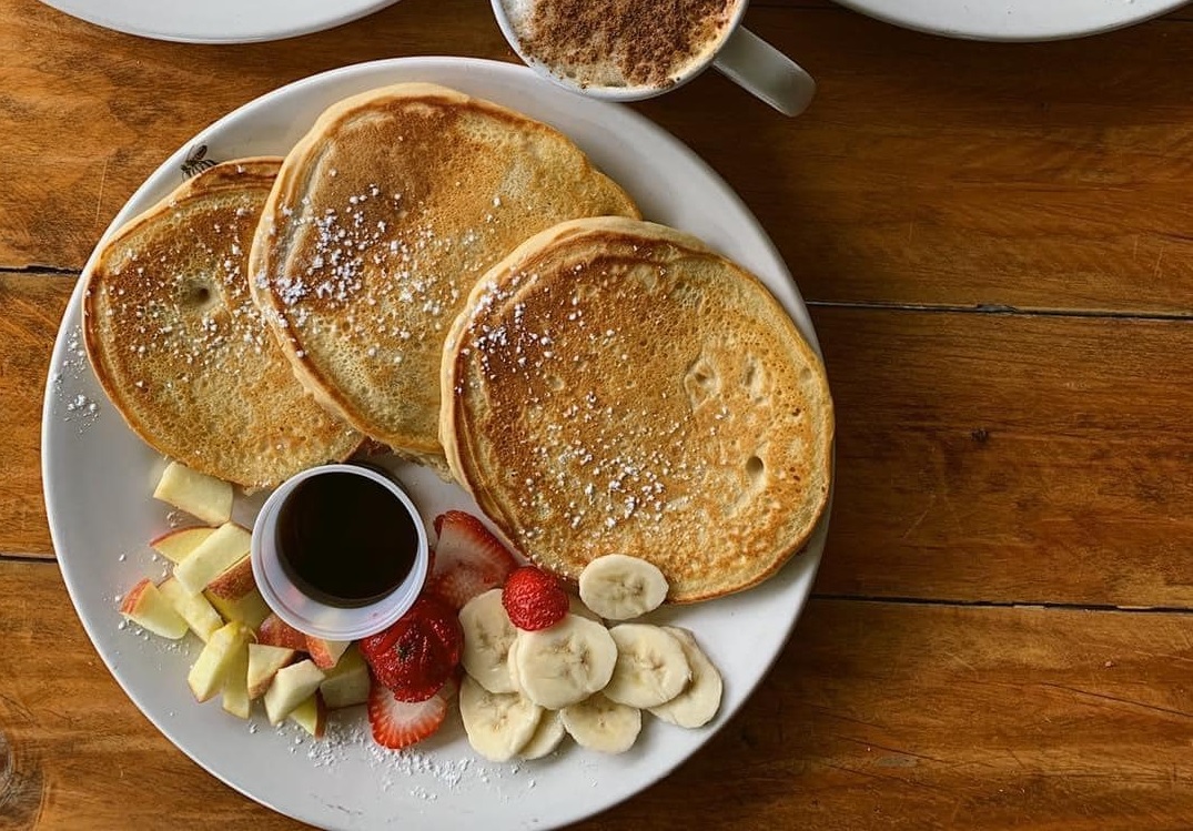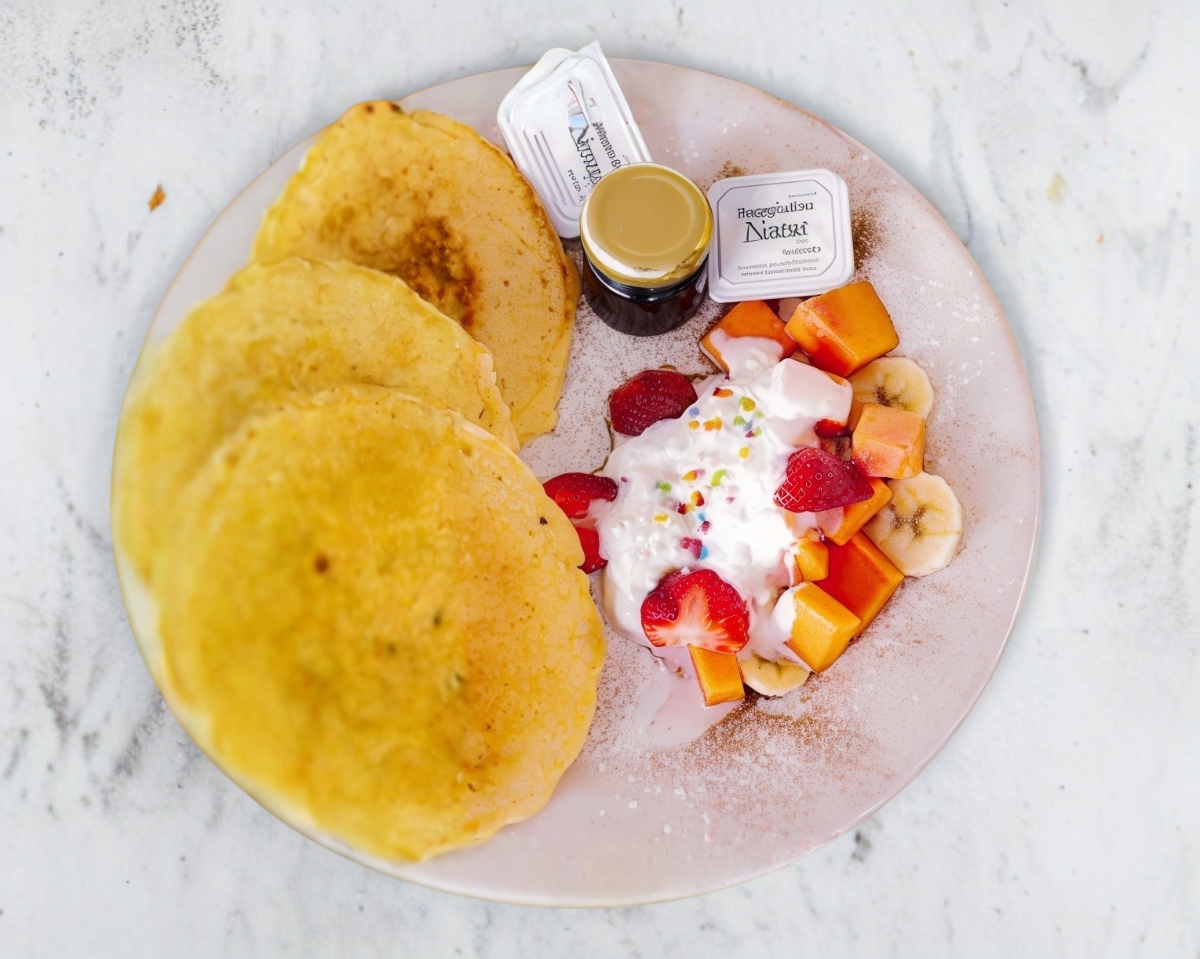 3 piezas acompañadas de fruta de temporada, mantequilla y miel de Maple