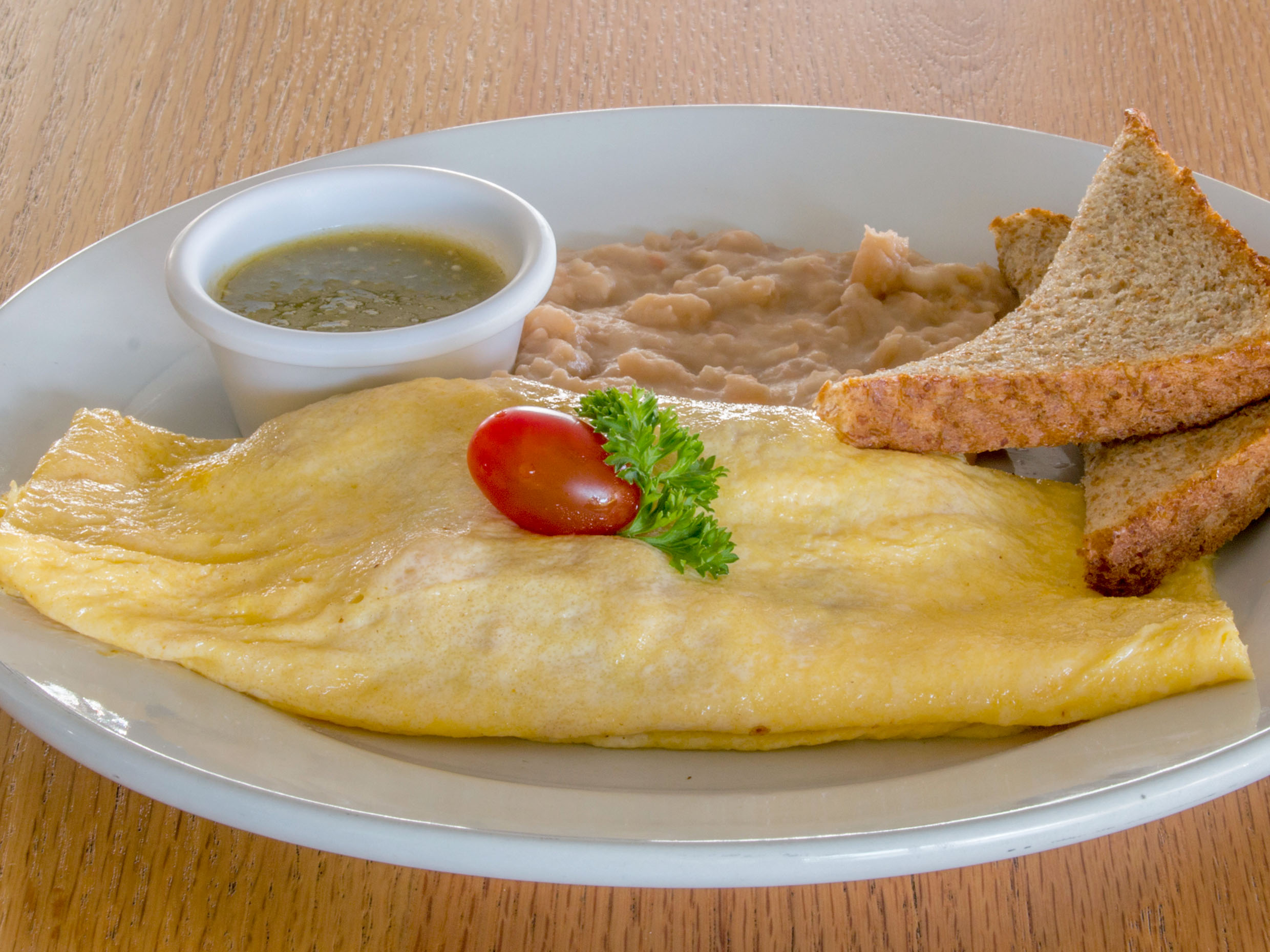 Omelette relleno de queso chihuahua, jamón de pavo, champiñones y tocino, acompañado de frijoles, bolillo y salsa.