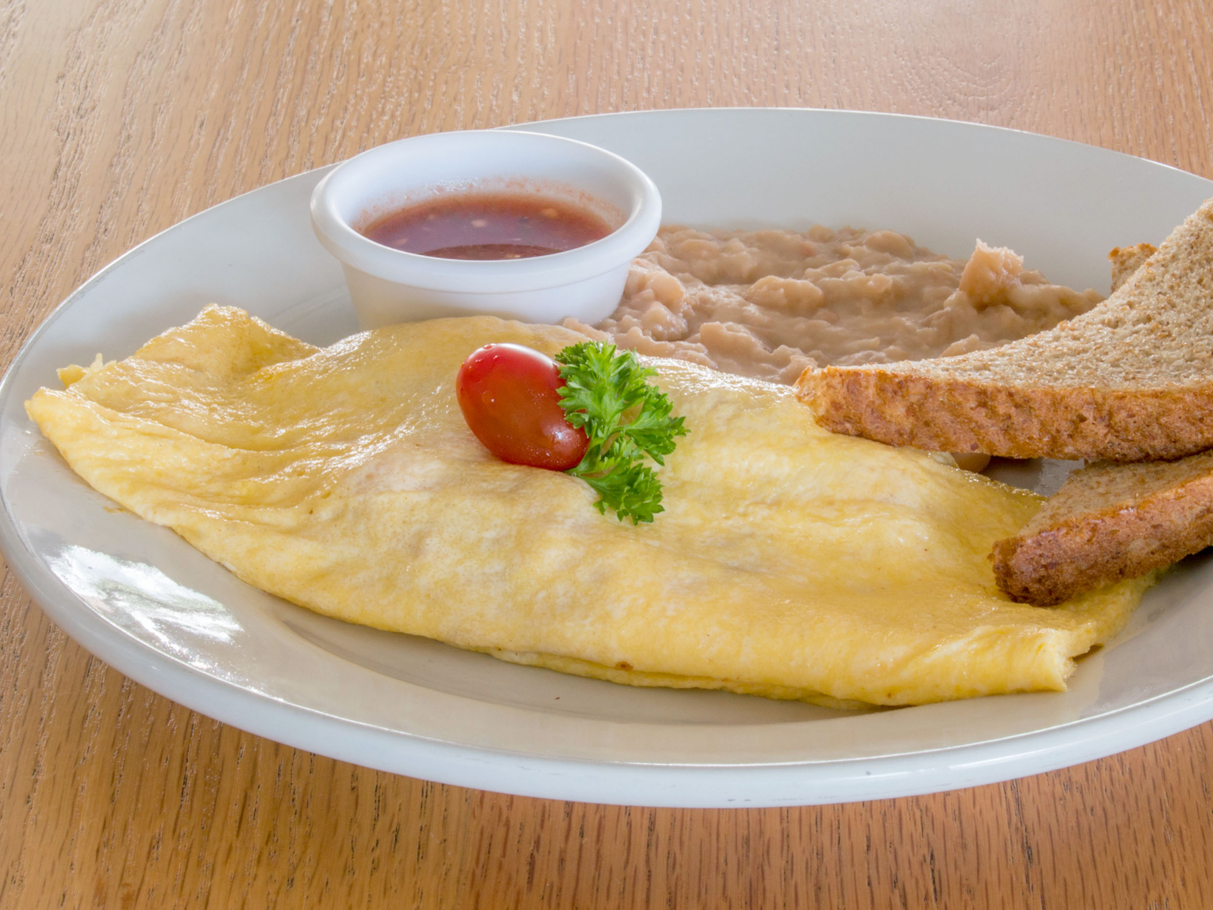 Omelette relleno de dos de las siguientes opciones: queso, champiñones, jamón o tocino. Acompañado de frijoles, bolillo y salsa.