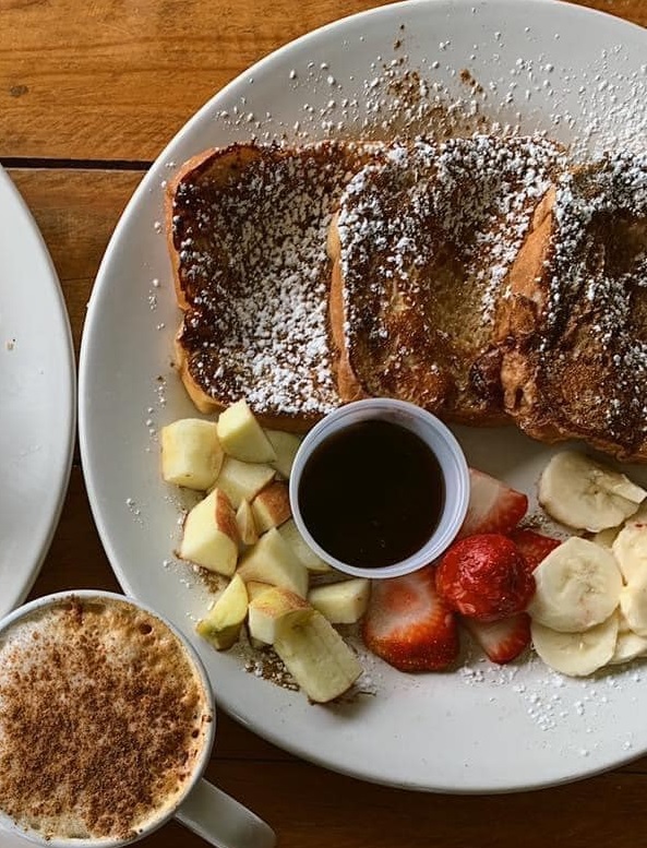 Tres piezas de pan francés, acompañadas de fruta de temporada y miel de Maple.