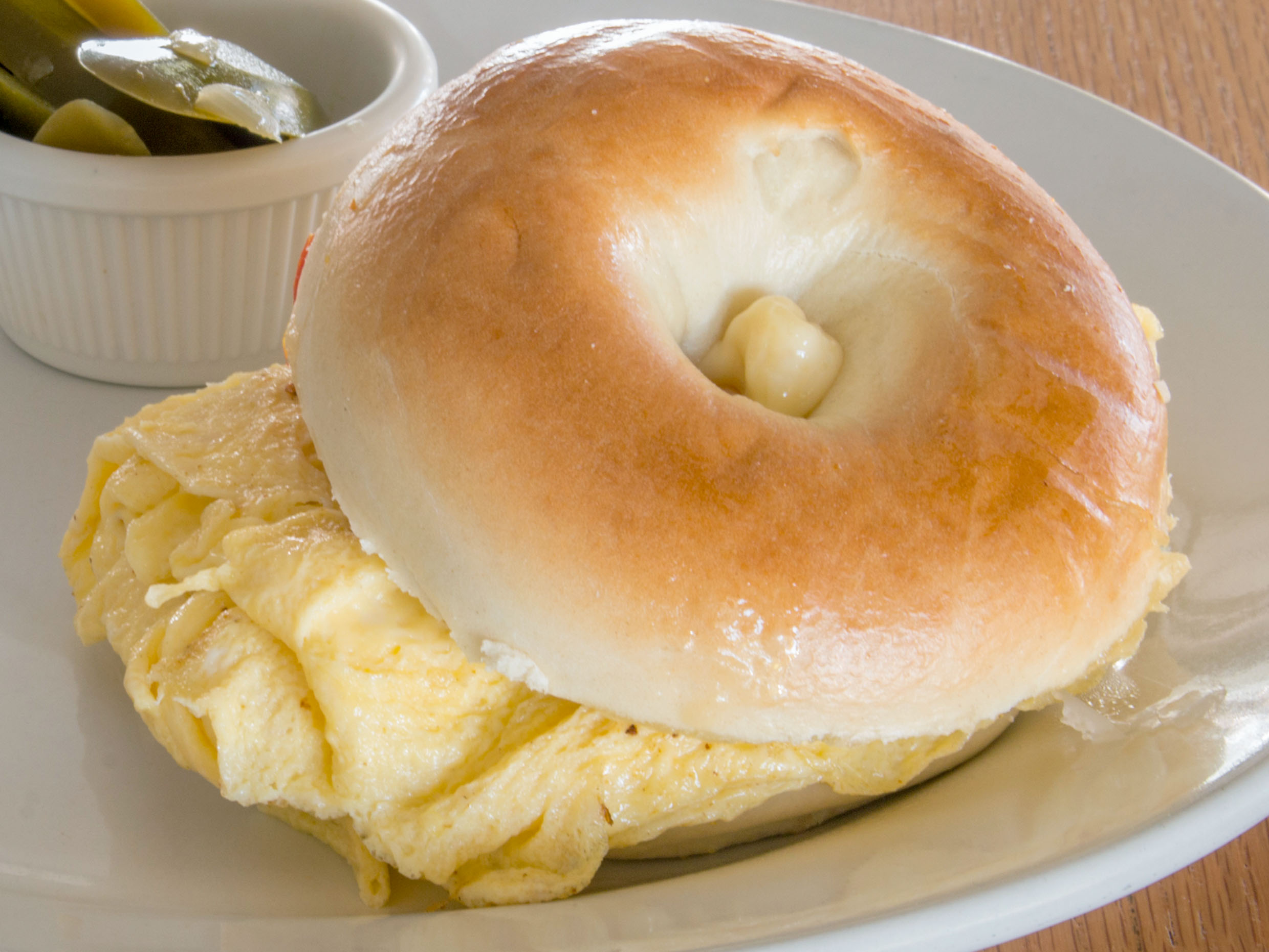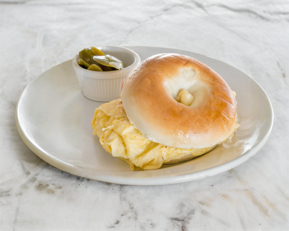 Pan de bagel, con una tortita de huevo, jamón de pavo, tocino, queso, lechuga y jitomate. Acompañado de chiles jalapeños.