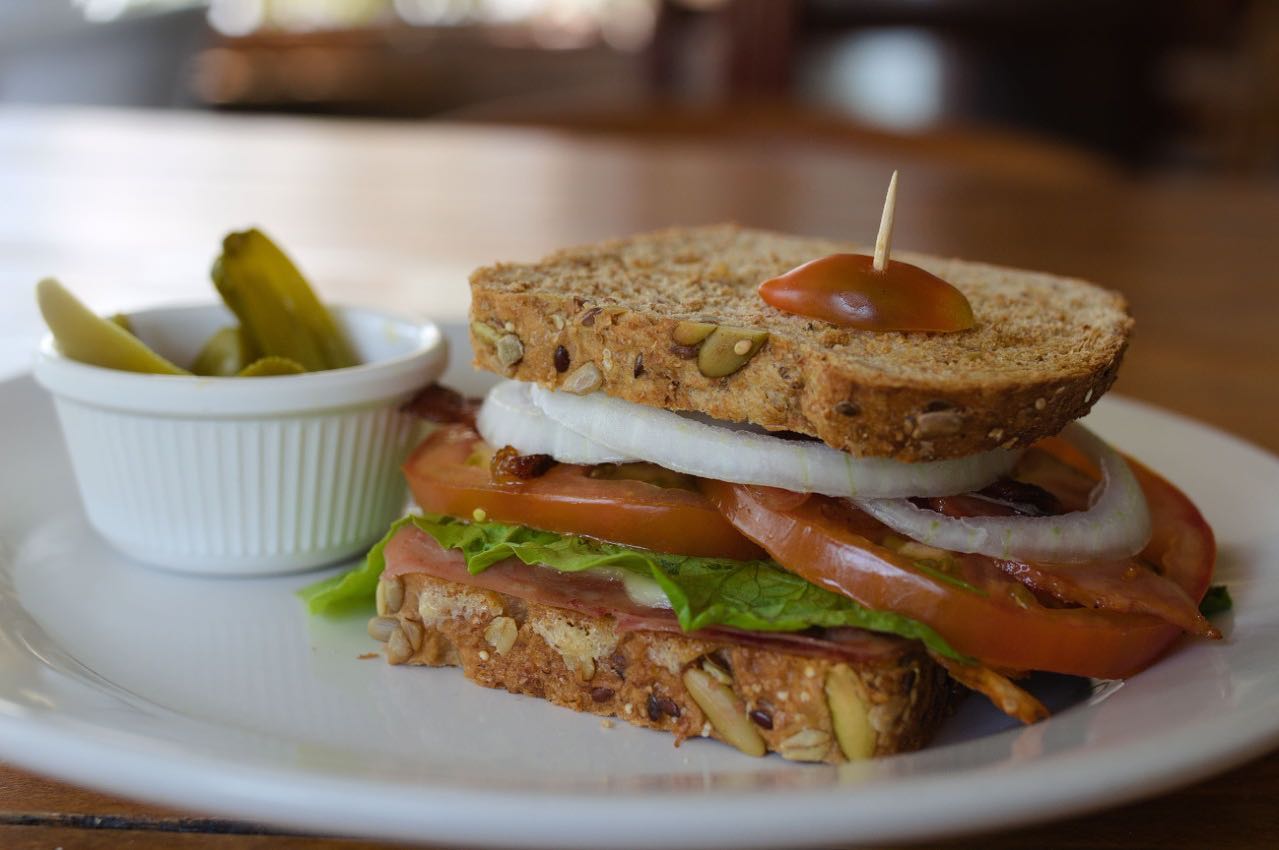 Pan integral con una tortita de huevo, jamón de pavo, queso, tocino, lechuga, jitomate y cebolla, acompañado de chiles jalapeños.