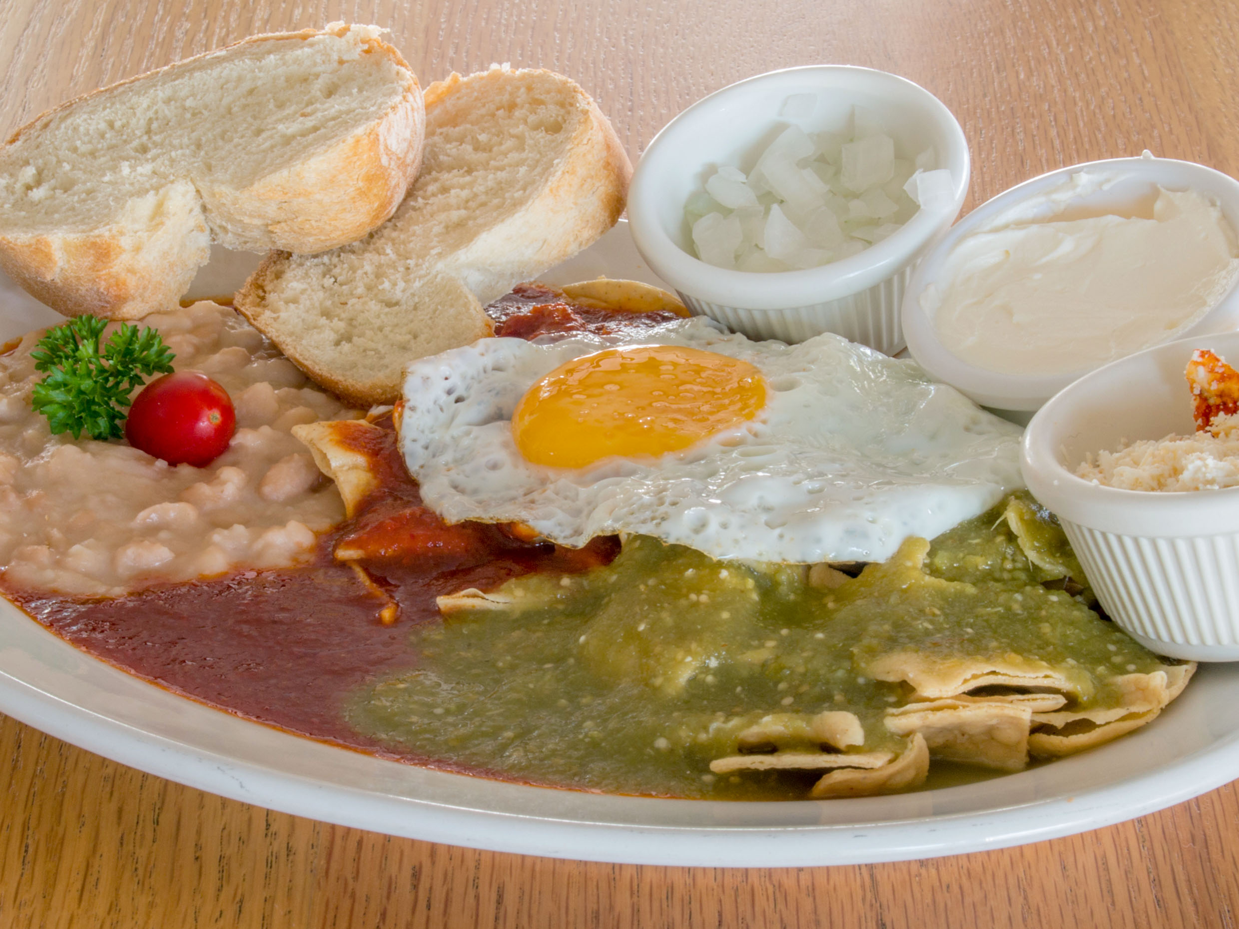 Chilaquiles con salsa verde, roja o divorciados, se les puede agregar huevo al gusto o pollo, acompañados de bolillo, cebolla, queso y crema