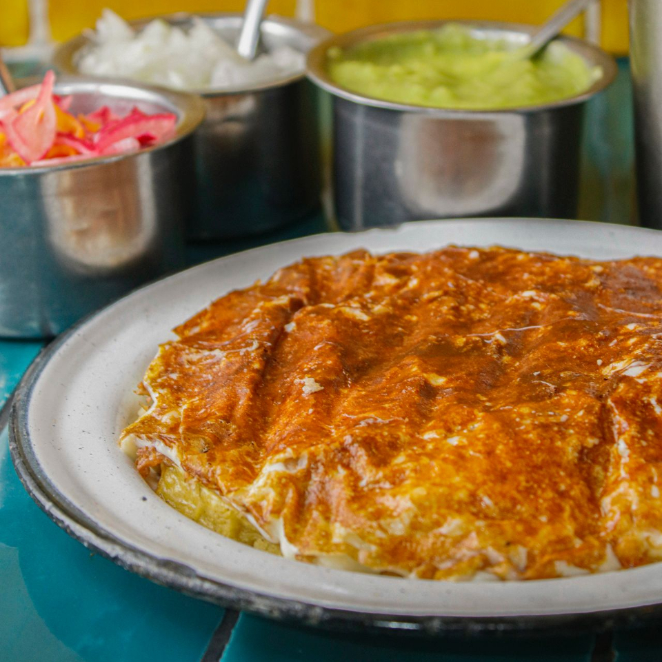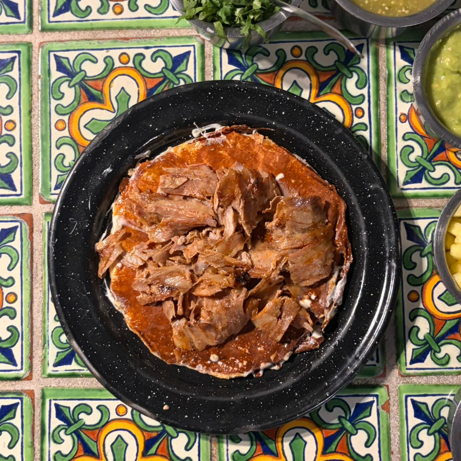 Individual: frijoles, carne y queso (pastor), con verduras por separado.
