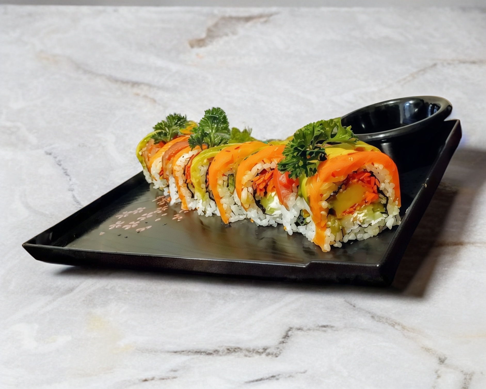 Por dentro: pepino,zanahoria,aguacate,por fuera:laminas de atún, salmon,y aguacate, con ajonjoli tostado.