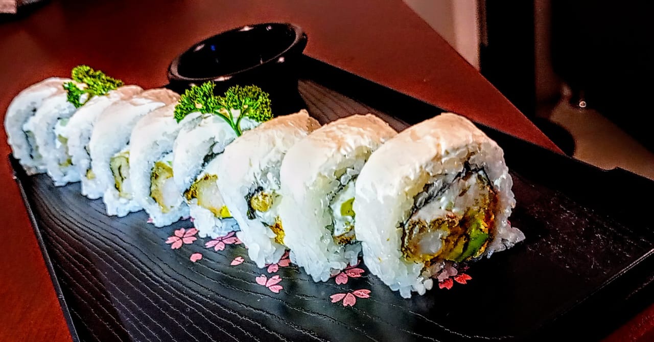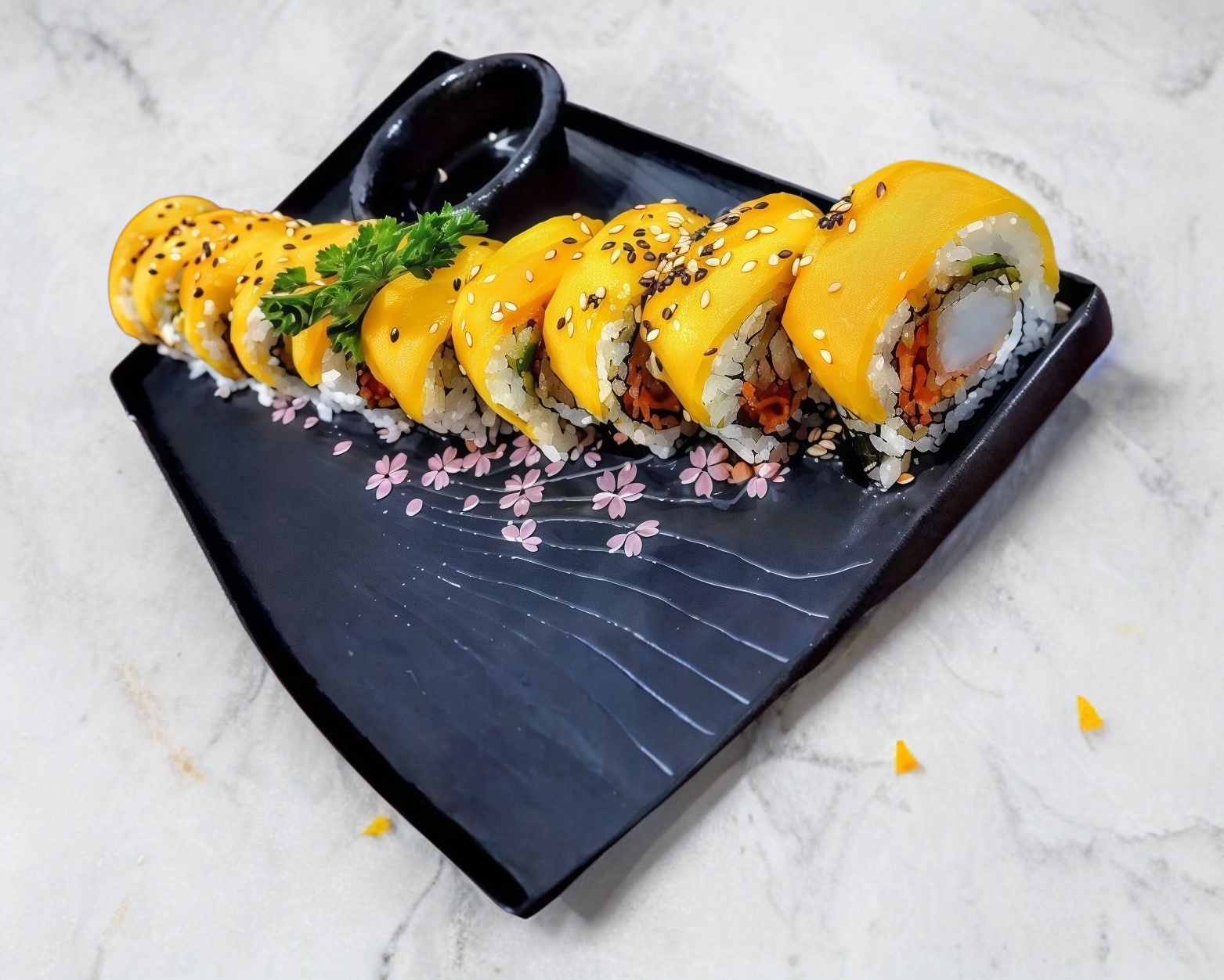 Por dentro: pepino, aguacate, zanahoria y queso philadelphia. Por fuera: plátano macho frito acompañado de salsa de anguila y ajonjolí tostado.