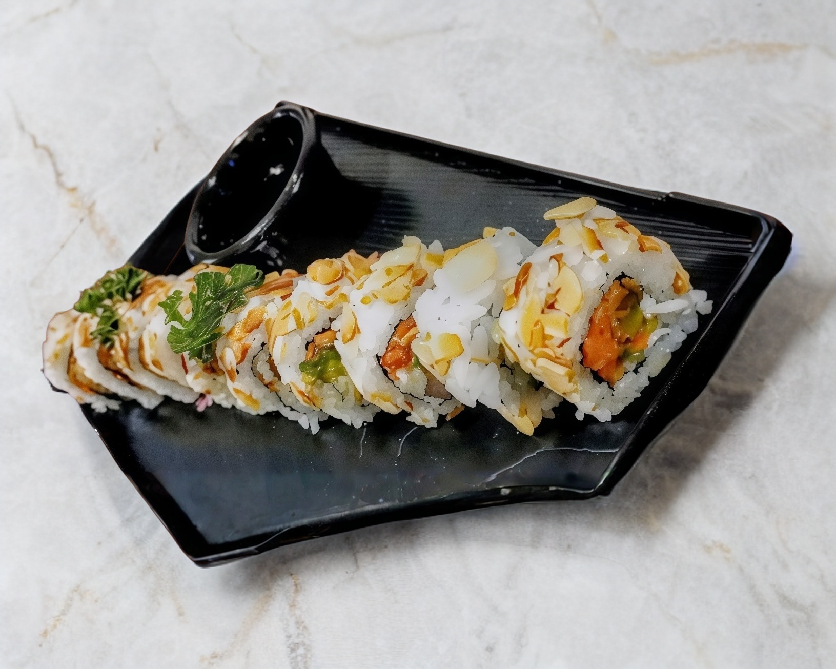 Por dentro: pepino, aguacate, zanahoria, queso philadelphia. Por fuera: arroz acompañado con almendra tostada bañado en salsa de anguila.