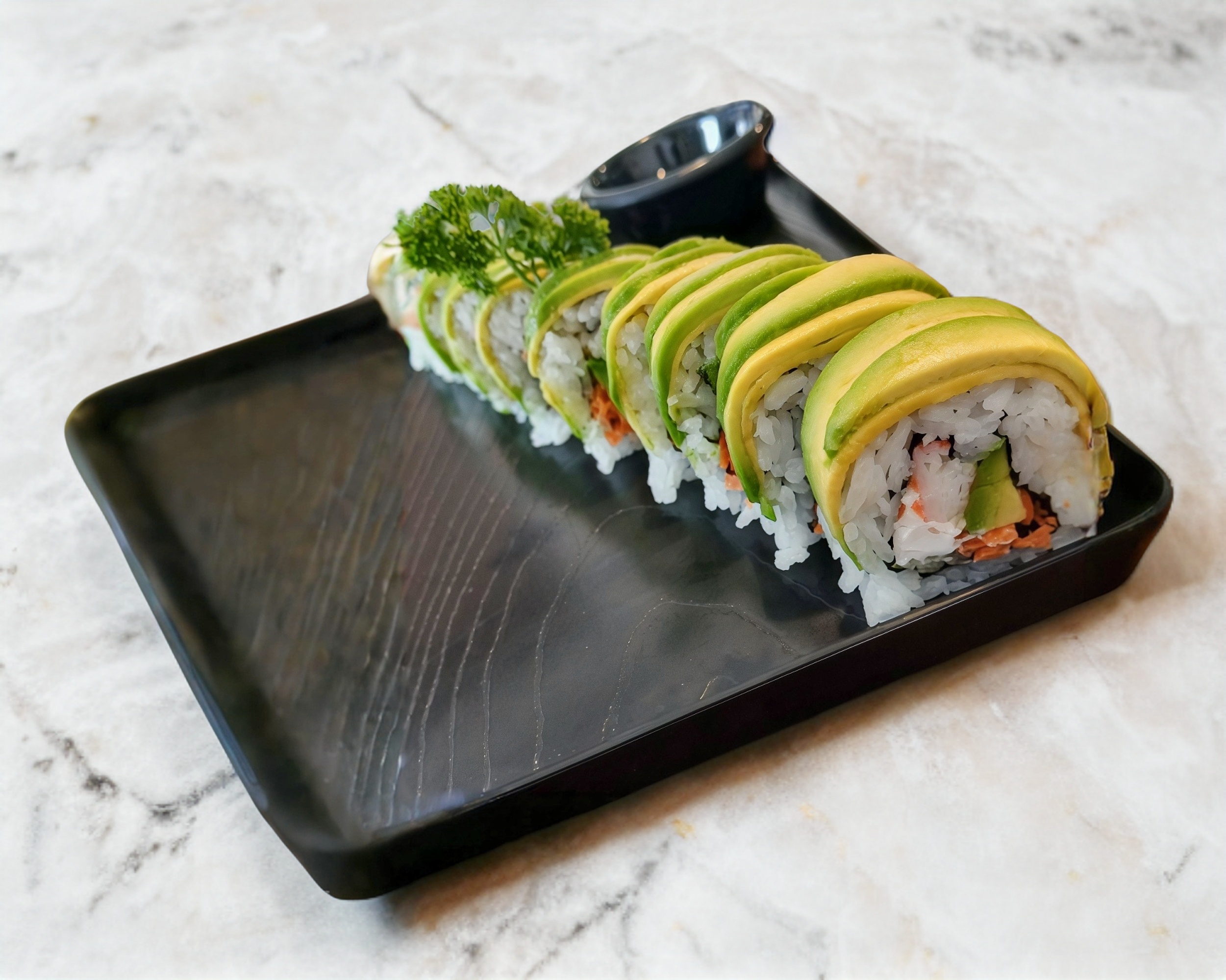 Por dentro: pepino, aguacate, zanahoria, queso philadelphia. Por fuera: aguacate.