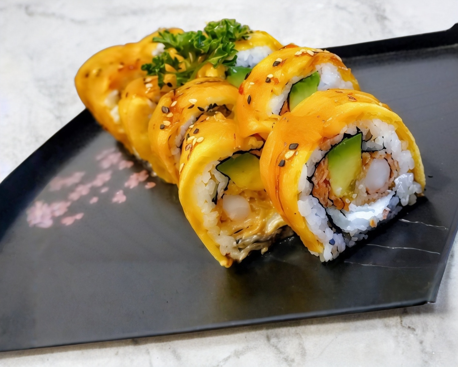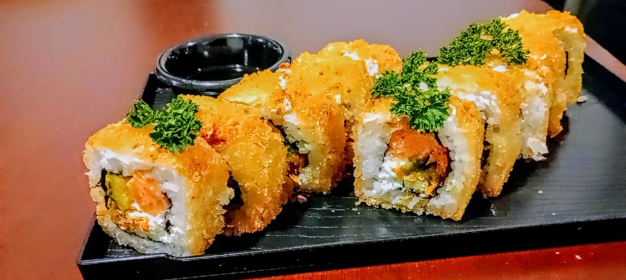 Por dentro: pepino, aguacate, zanahoria, queso philadelphia. Por fuera: philadelphia encima empanizado.