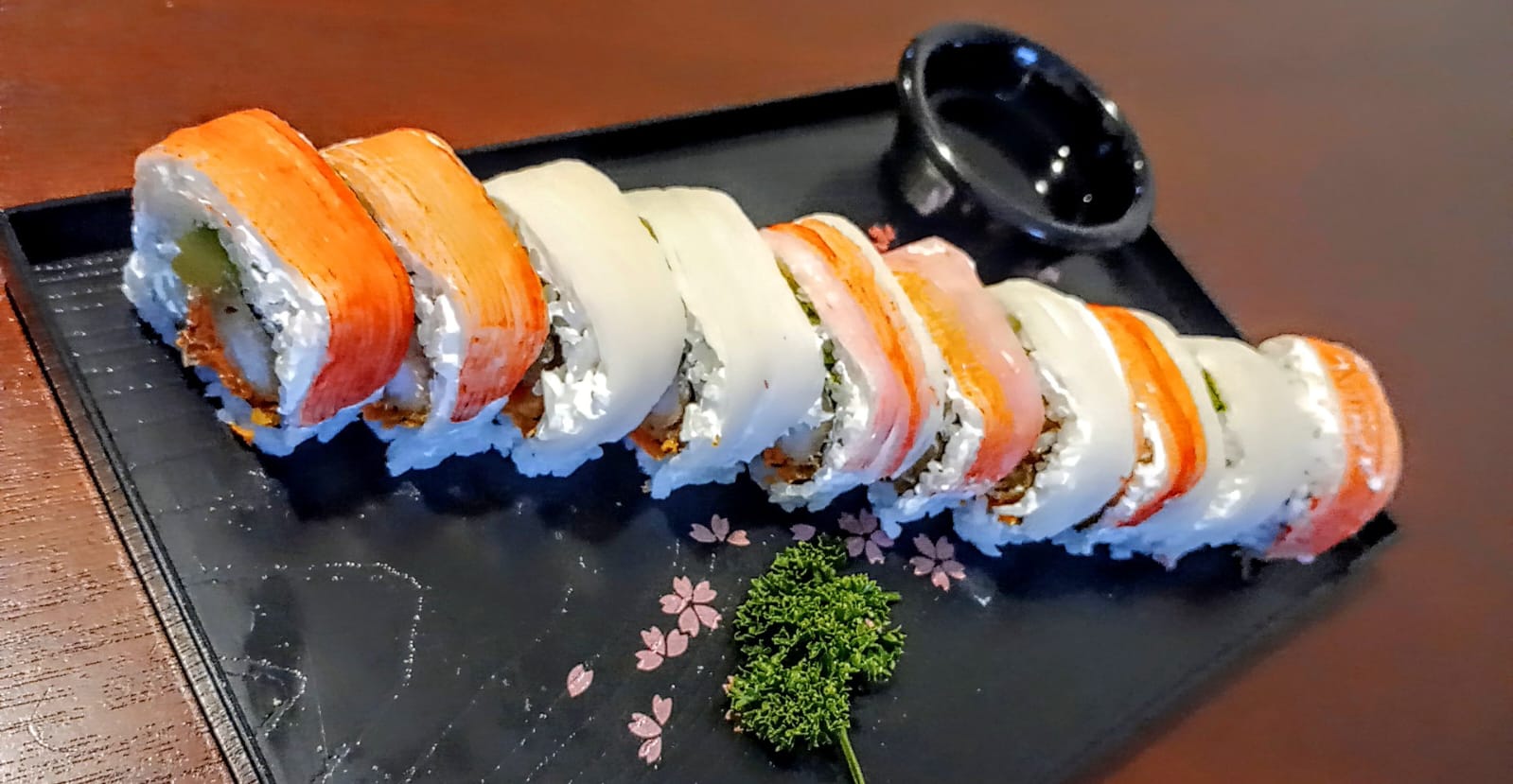 Por dentro: pepino, aguacate, zanahoria, queso philadelphia. Por fuera: kanikama.