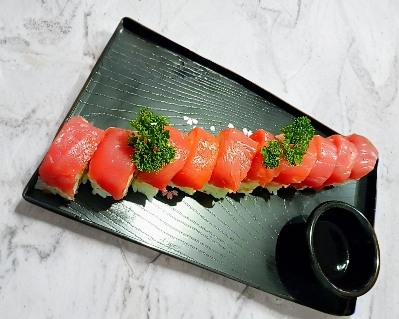 Por dentro: pepino, aguacate, zanahoria y cebollín. Por fuera laminas de atún y ajonjoli tostado.