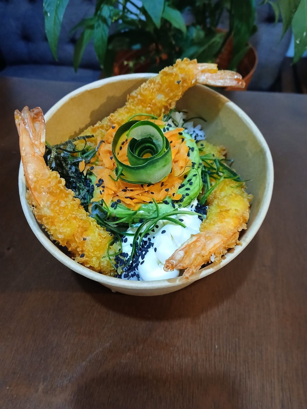 Tazón de arroz japonés cubierto con camarones salteados al estilo oriental, acompañados de vegetales frescos y bañados en una salsa especial de la casa. Una opción deliciosa, ligera y llena de sabor.