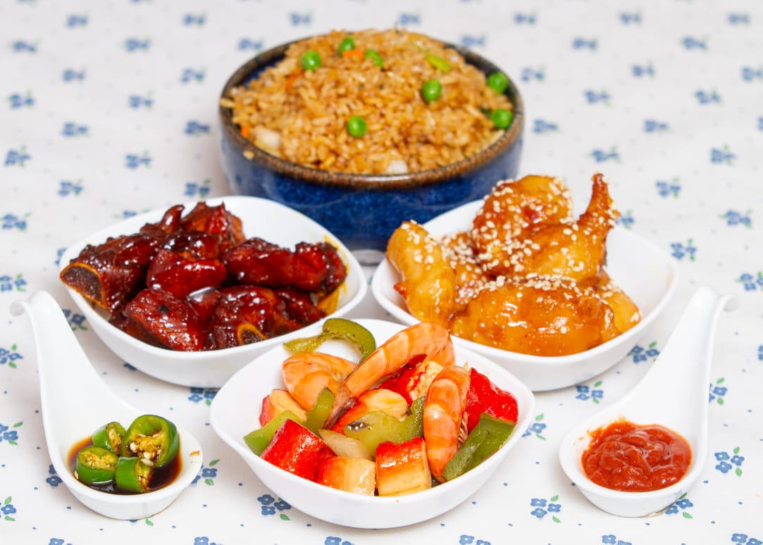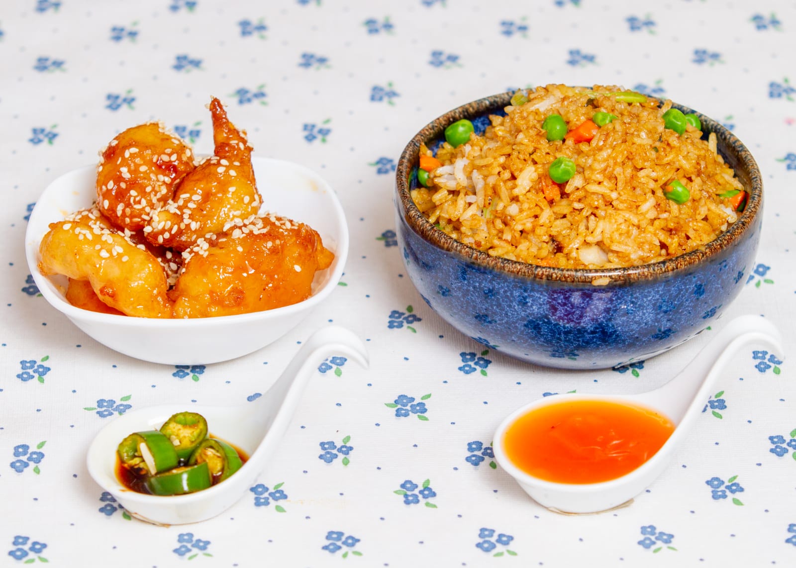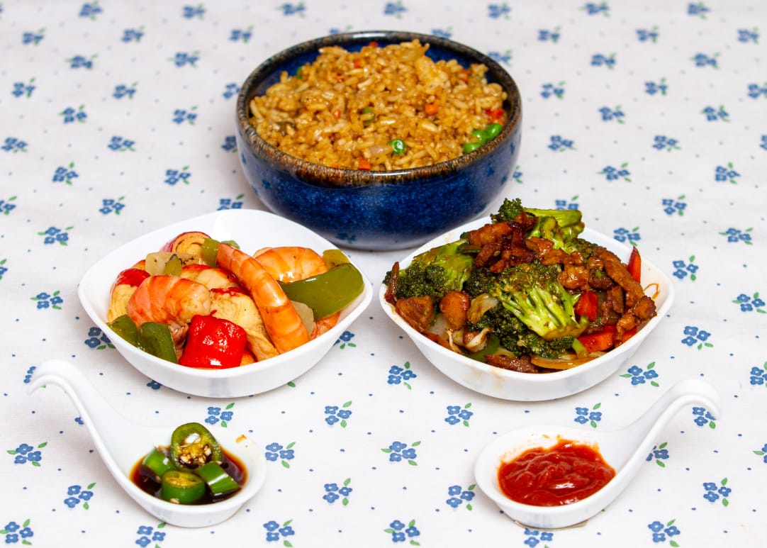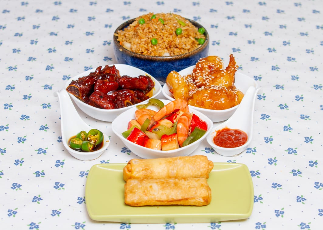 3 guisos a tu eleccion, 1 bowl de arroz frito, 1 bowl de chow mein y 3 rollitos primavera de verduras