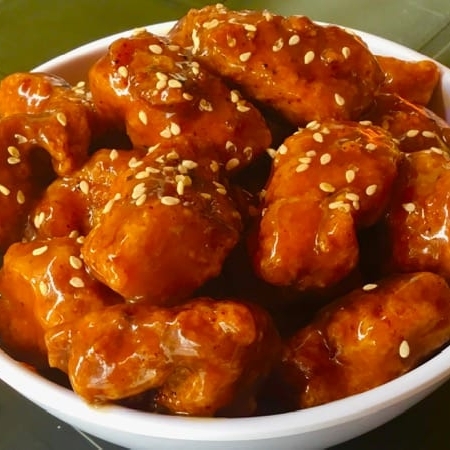 Tiernos trozos de pechuga de pollo fritos, bañados en una salsa agridulce con toques cítricos de naranja natural. (570 g).