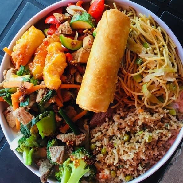 Porción grande que incluye 3 platillos a elegir y 2 acompañamientos. (1200 g).