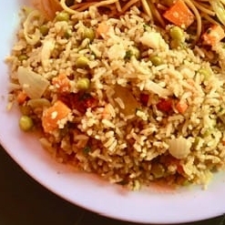 Arroz salteado al wok con vegetales y un toque de soya.