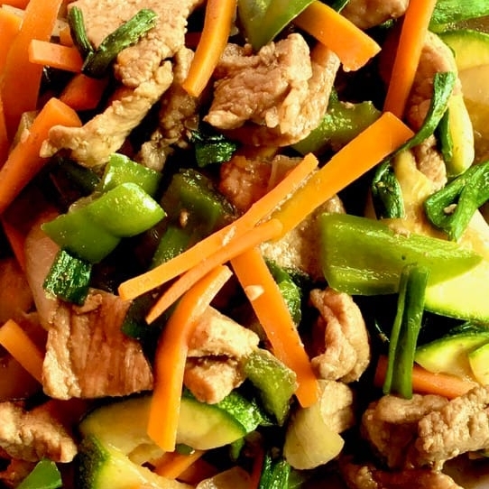 Carne de cerdo salteada con marrón, cebollín largo, cebolla y zanahoria con un toque de especias coreanas. (570 g).