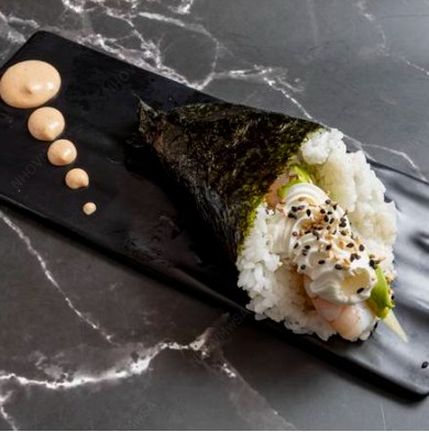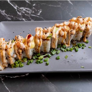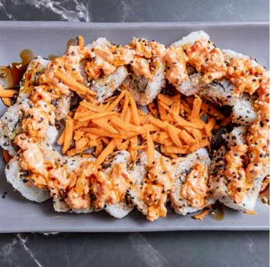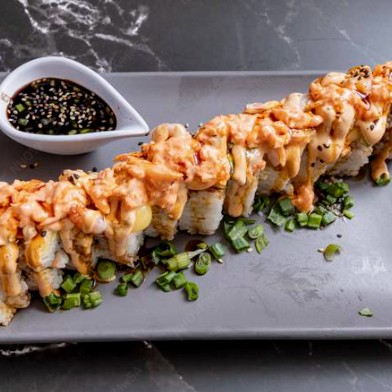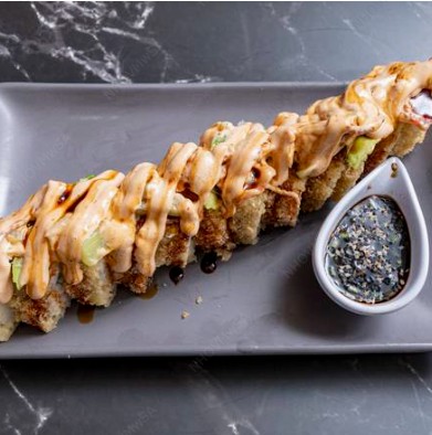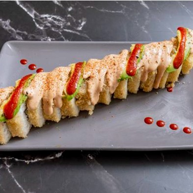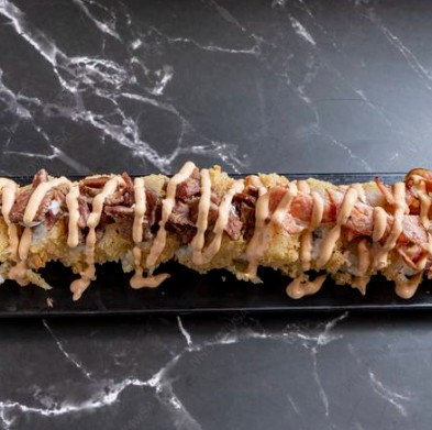 Rollo empanizado relleno de alga, pepino, philadelphia, aguacate, pollo empanizado. Topping de res picado y tocino bañado en salsa spicy.