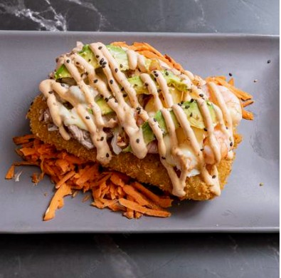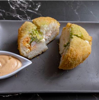Bola de arroz empanizada, rellena de camarón, philadelphia, ensalada de surimi y aguacate.